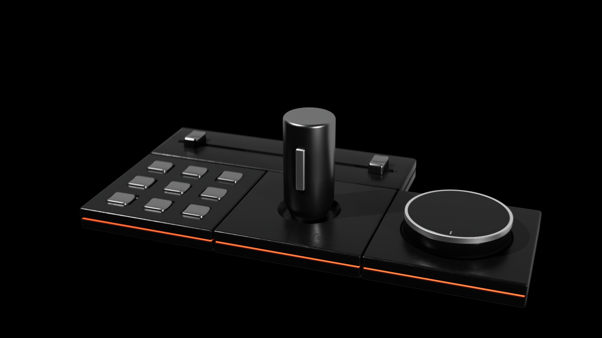 Wir haben uns für schlichte, elegante Materialien entschieden, welche den professionellen Kontext unseres Interfaces unterstreichen sollen. Dazu haben wir vor allem auf helles und dunkles, gebürstetes Aluminium, kombiniert mit Elementen aus Gummi gesetzt. Den Eyecatcher bildet hierbei der leuchtend orangene LED-Lichtstreifen, der alle Elemente umgibt, um so das Gefühl eines zusammenhängenden Produkts zu schaffen.
