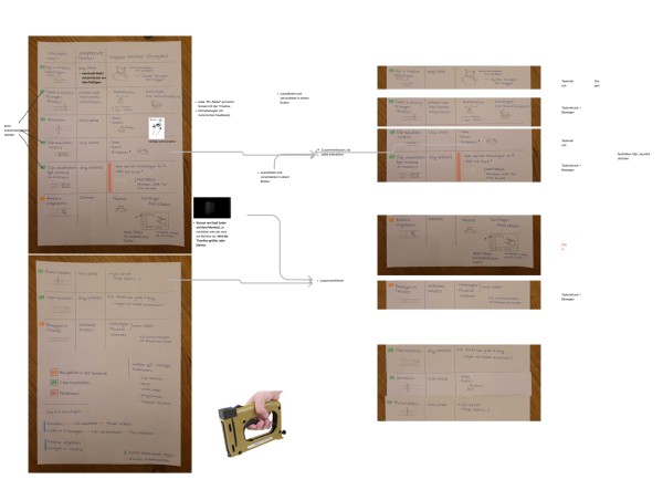 Dieses Konzept haben wir in einem einfachen Prototyp aus Pappe umgesetzt, um so ein besseres Gefühl für die Affordance, Größe und Anordnung der einzelnen Elemente zu bekommen.