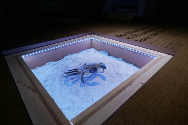 An diesem Punkt können sie die Platte umdrehen, um auf die Tischseite zu kommen. Dort können Besucher:innen zuerst verschiedene Fallen begutachten und dann mehr über das Unternehmen “Holy Crab” lernen. Dann dürfen sie nochmals auf die andere Seite des Tisches, wo sie ein Rezeptbuch finden, das zwei verschiedene Rezepte mit Chinesische Wollhandkrabben zeigt. Die entsprechenden Gerichte werden immer als Illustration auf die Teller projiziert. Zum Abschluss gibt es eine kleine ethische Fragestellung, mit Karten zum mitnehmen, auf diesen ist auf der einen Seite ein Glückskeks zu sehen, auf der anderen eine ethische Frage die ein bisschen zum Denken anregen soll.