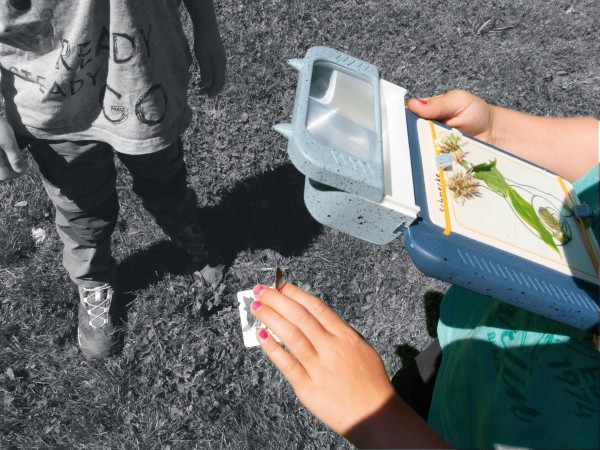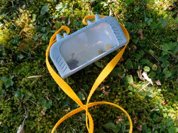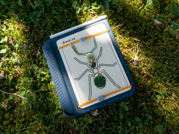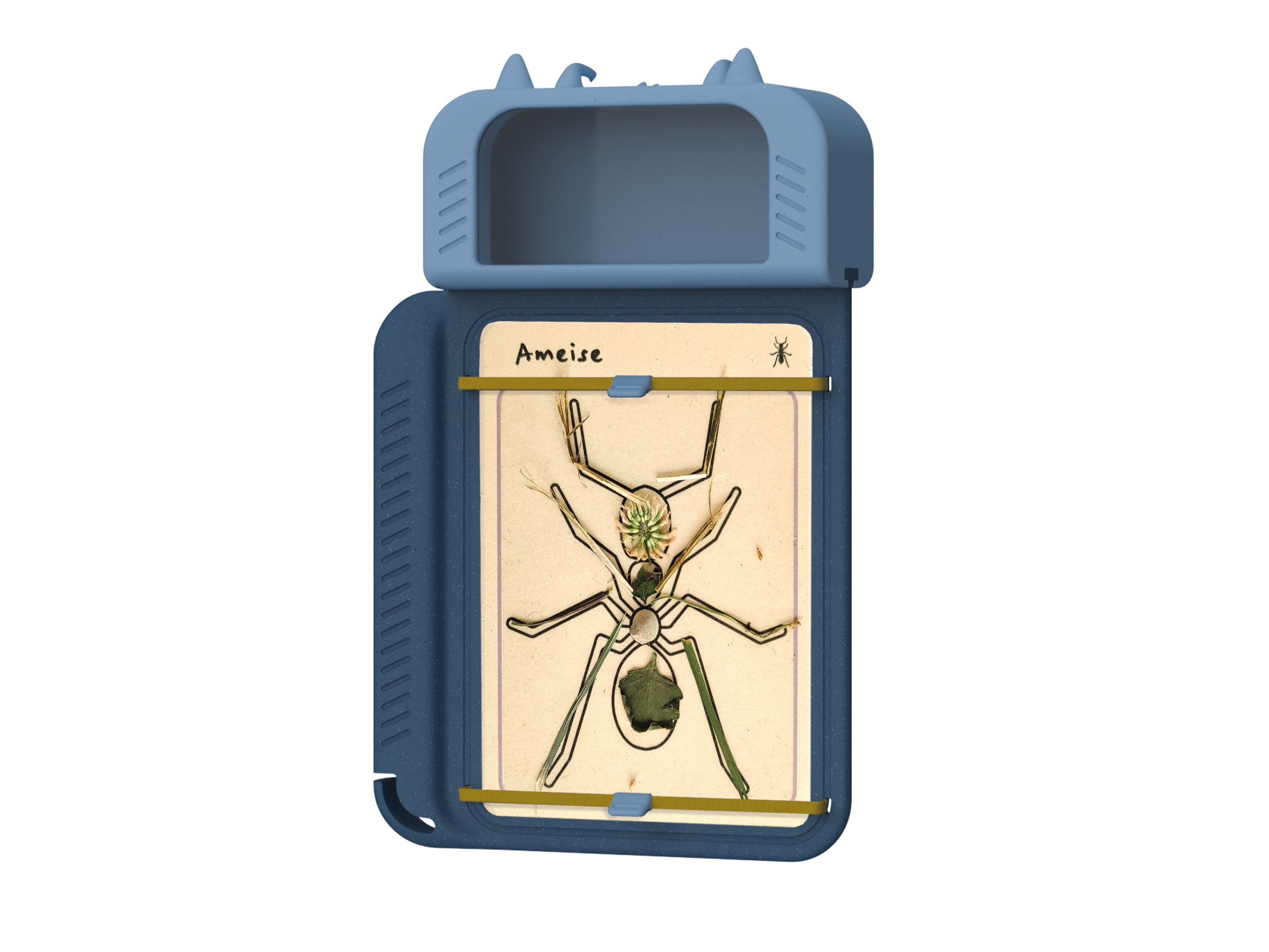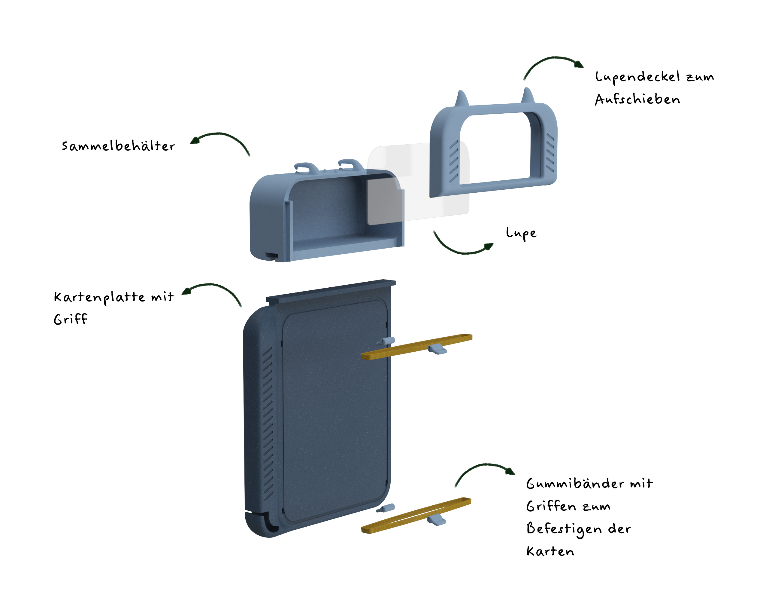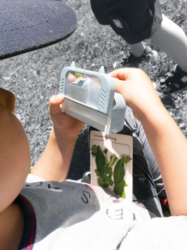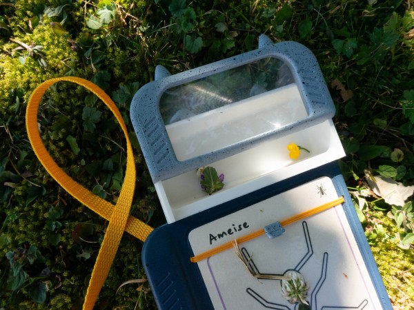 Mit dem Sammelbehälter mit Lupendeckel, der nach oben aufgeschoben werden kann, können die Kinder ihre kleinen Schätze bewundern und Materialien zum Aufkleben sammeln. Sammelbehälter und Kartenplatte können je nach Bedarf zusammengesteckt und gemeinsam oder getrennt verwendet werden und dabei mit einem einfachen Umhängegurt vom Kind transportiert werden.