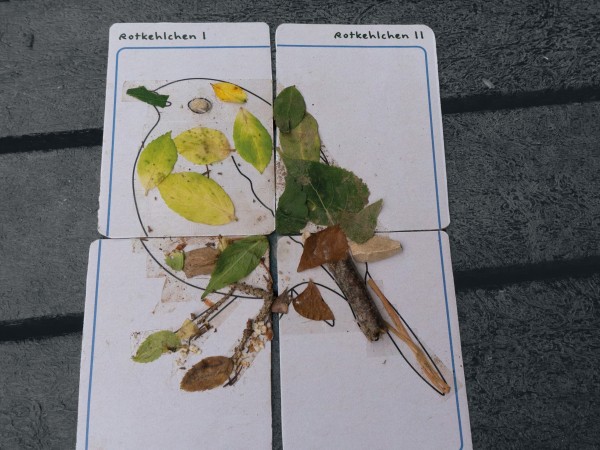 Die Karten zeigen die Umrisse einheimischer Waldtiere sowie deren Namen. Über den Umrissen befindet sich eine Klebefolie, auf die die Kinder verschiedenste Naturmaterialien, wie zum Beispiel kleine Steine, Blätter oder Blumen , legen können, um die Tiere nachzugestalten. Dabei lernen sie spielerisch und kreativ verschiedene Materialien und Tiere kennen.