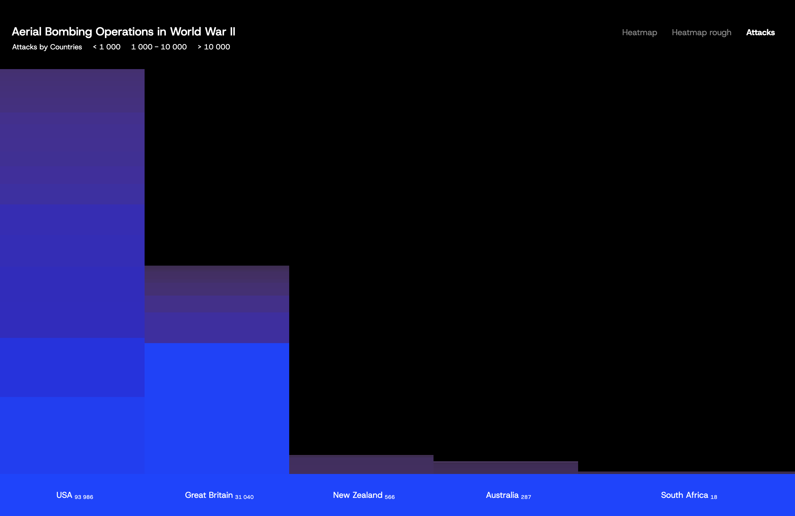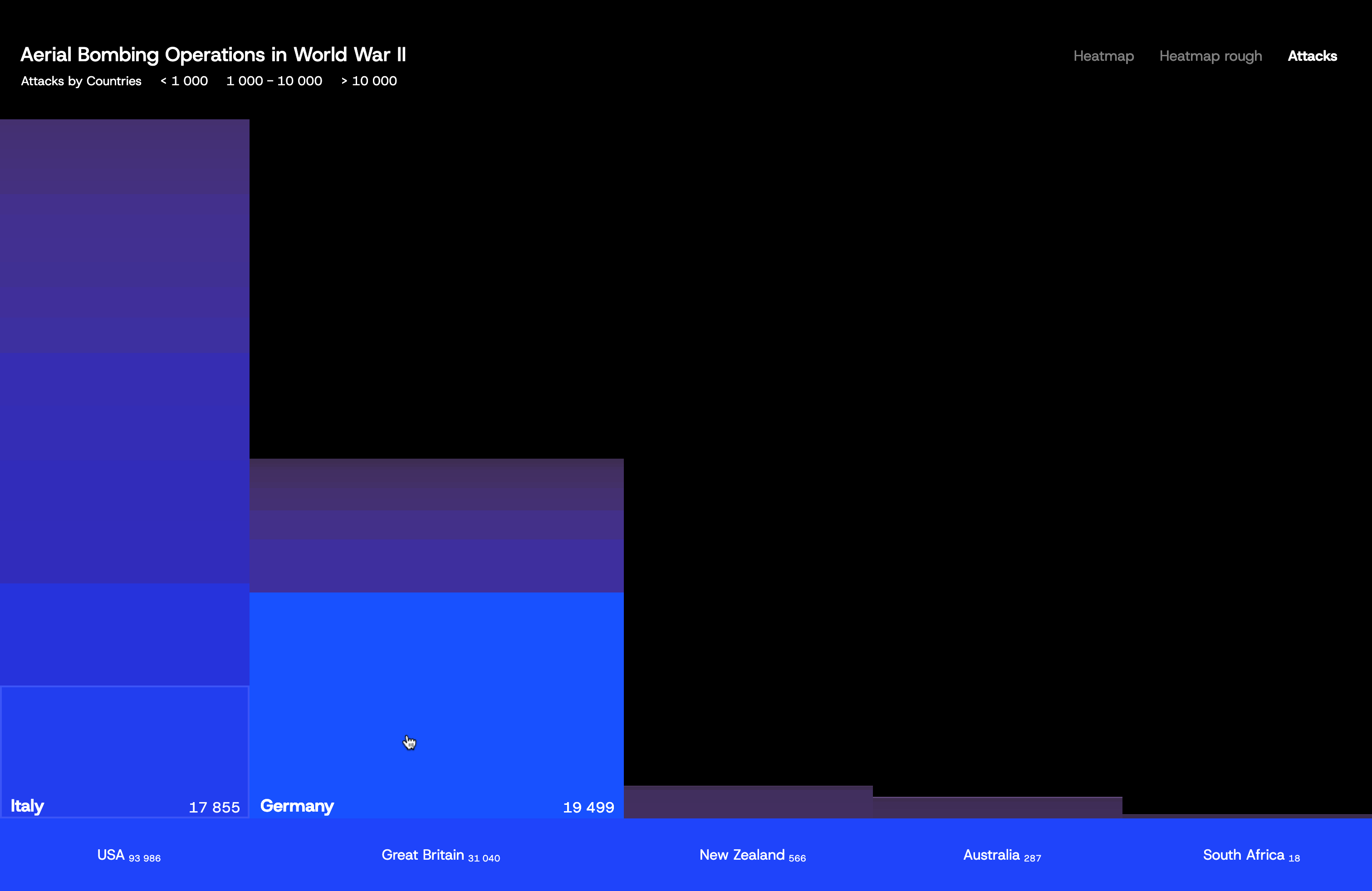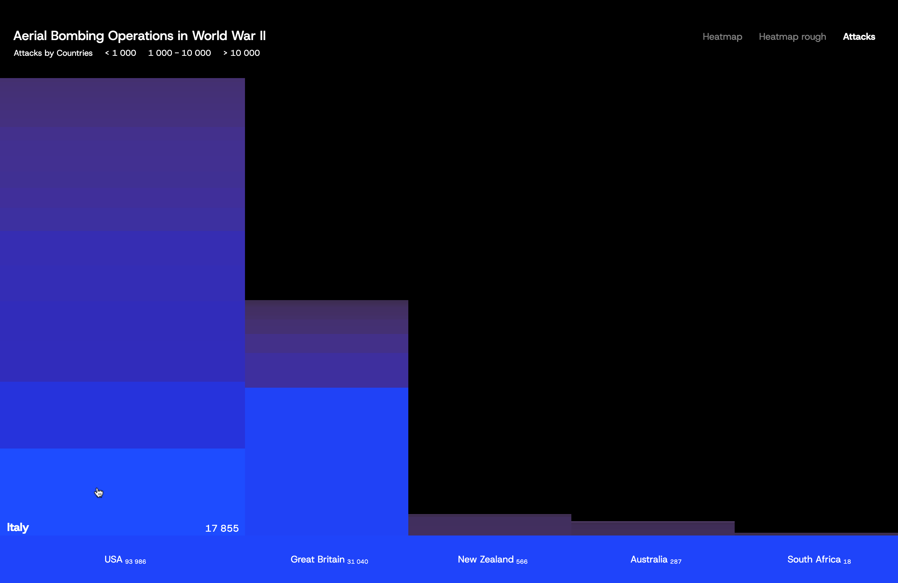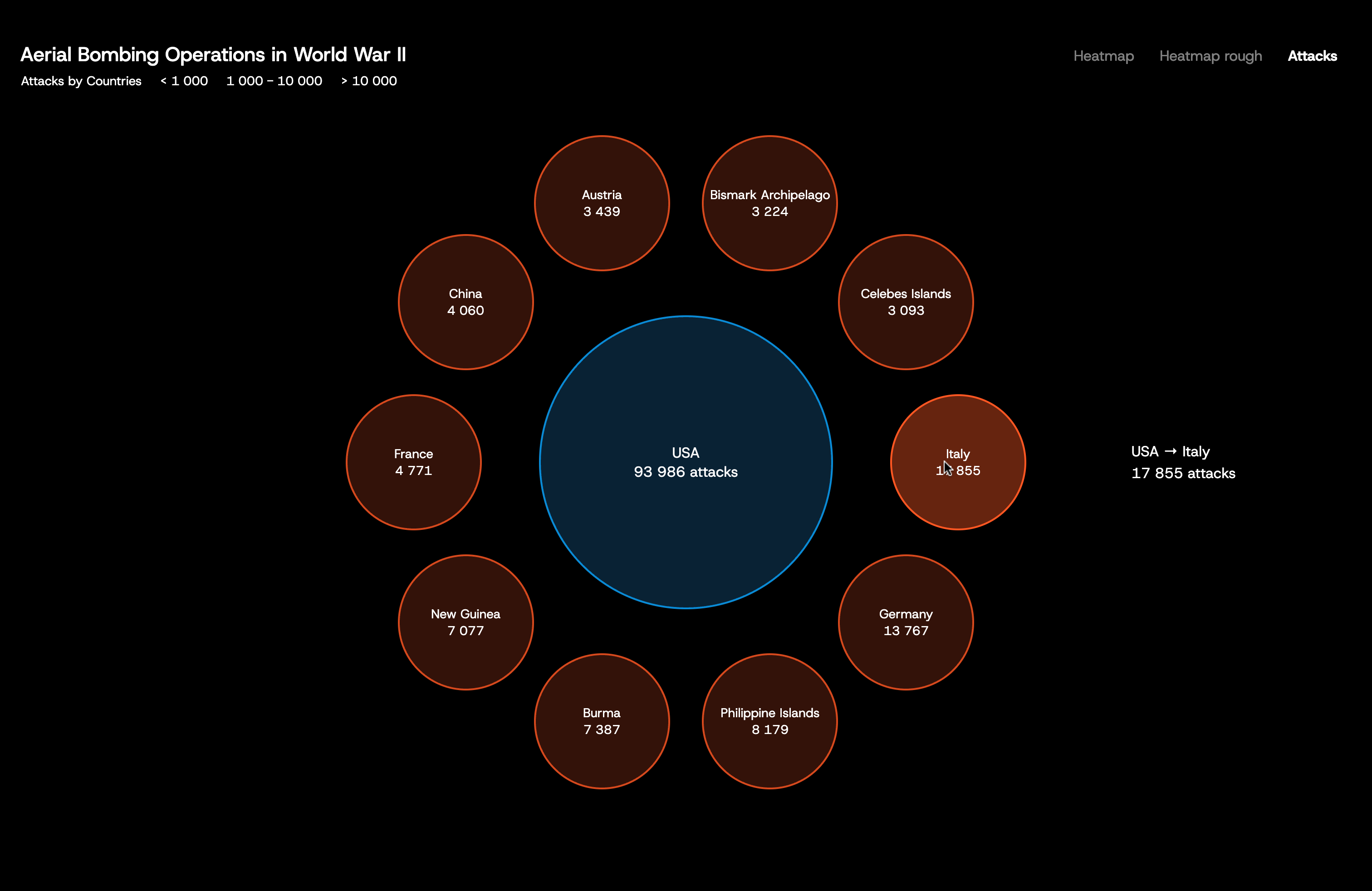 Diese Datenvisualisierung zeigt die Verteilung der Luftangriffe im Umfeld Deutschlands während des Zweiten Weltkriegs. Darüber hinaus veranschaulicht sie die Beziehungen zwischen den beteiligten Ländern, indem sie aufzeigt, wie häufig einzelne Nationen andere angegriffen haben.