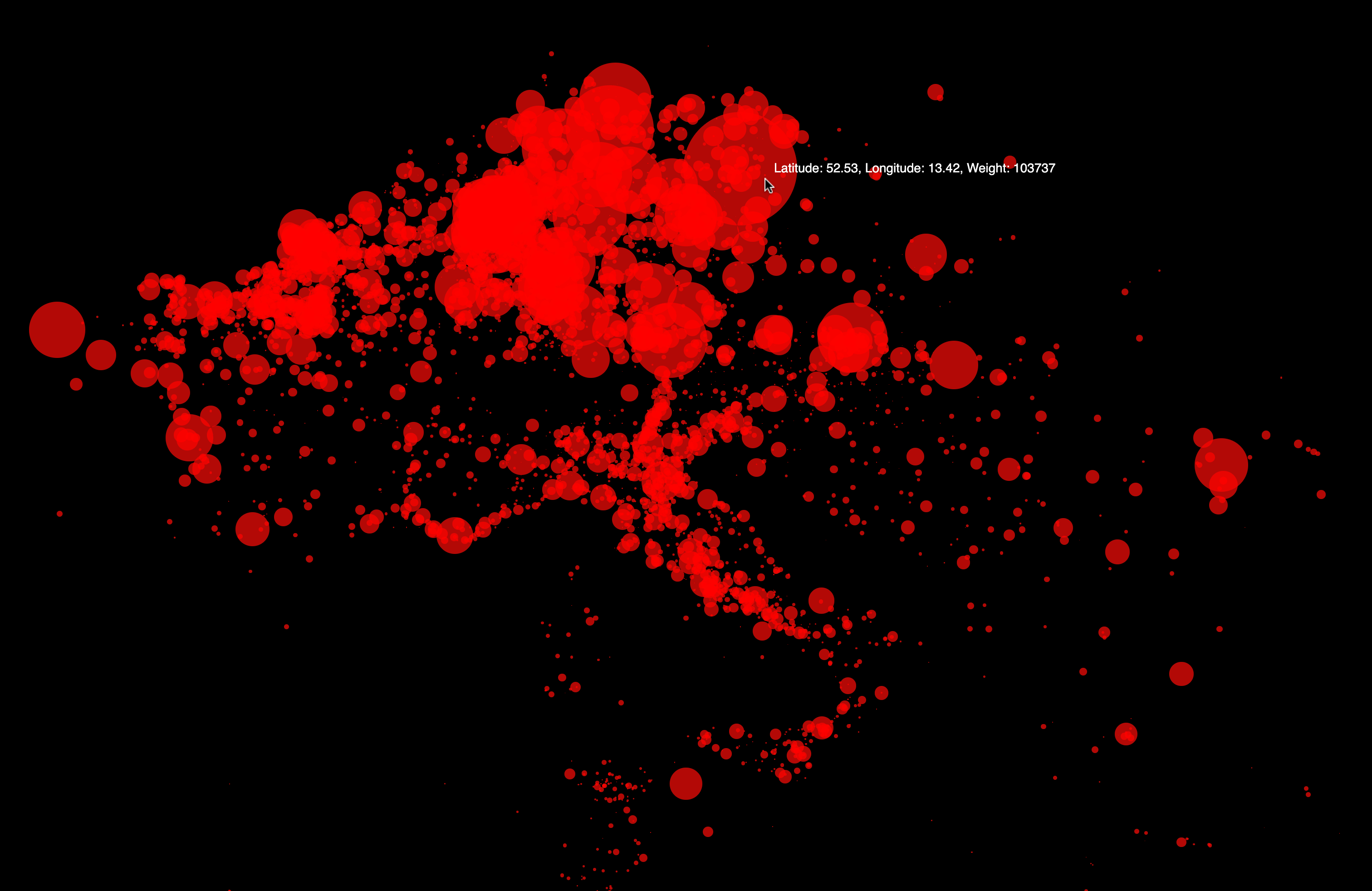 Nachdem ich diesen herausgesucht hatte, musste ich ihn erst einmal kürzen. Dazu entfernte ich zuerst unnötige Spalten, für den ersten Datensatz waren das alle außer die Spalten Longitude, Latitude und Weight (tons). Danach rundete ich die Werte von Longitude und Latitude und fasste alle Zeilen mit demselben gerundeten Wert zusammen, wodurch aus einzelnen Zielen Bereiche wurden. Je weiter man die Nachkommastellen kürzt, desto größer werden diese Bereiche und desto gröber wird die Heatmap.