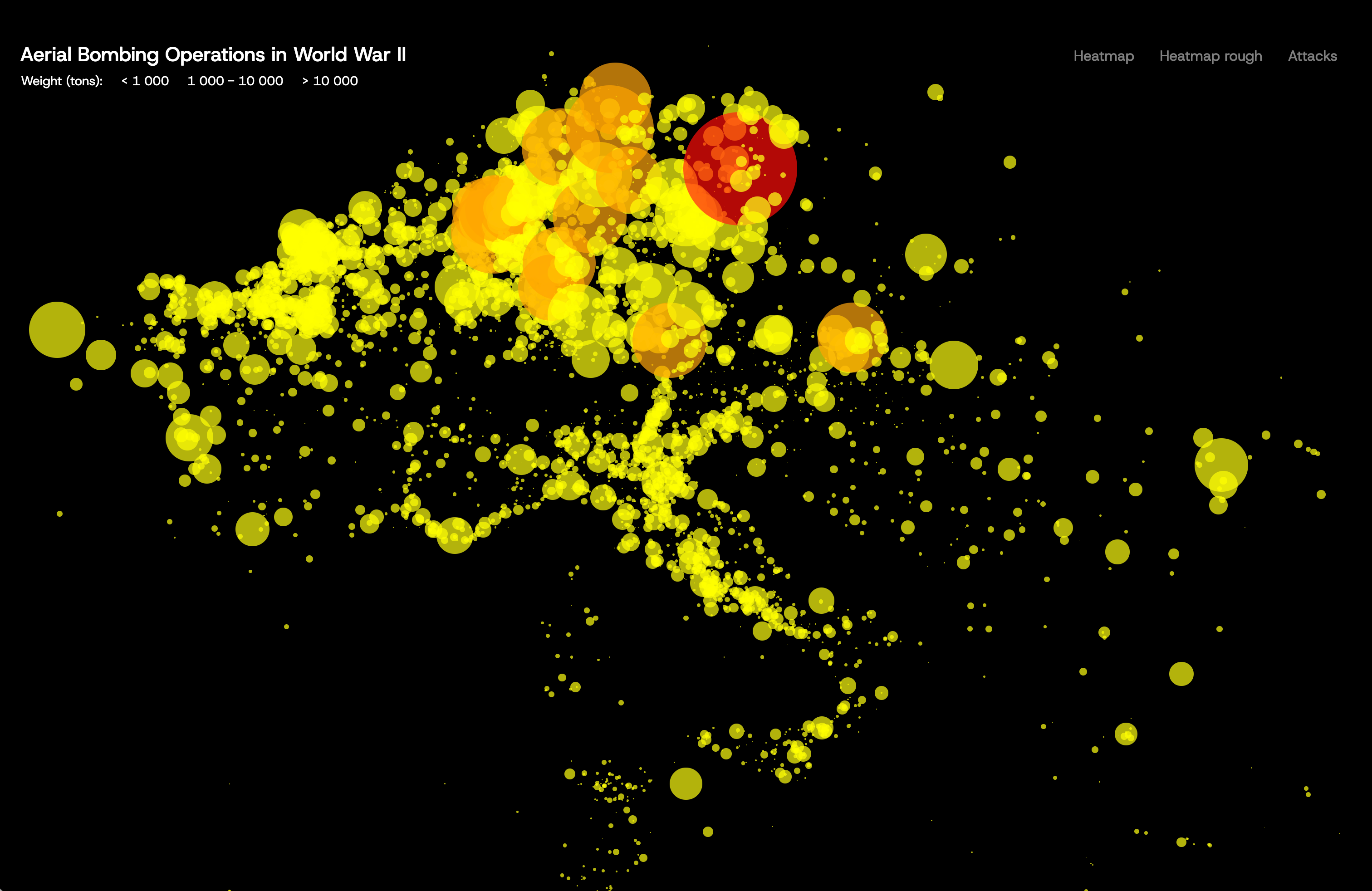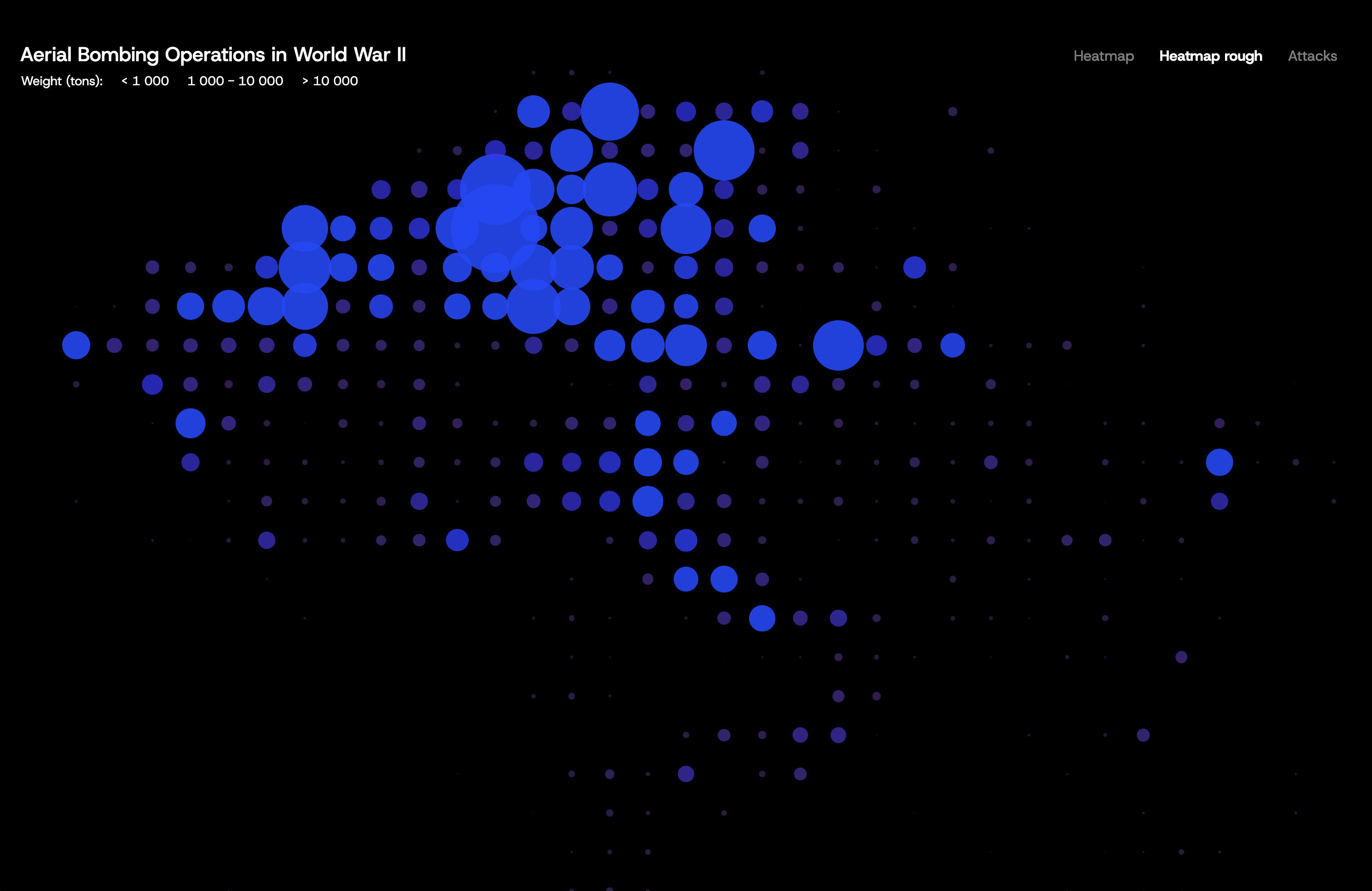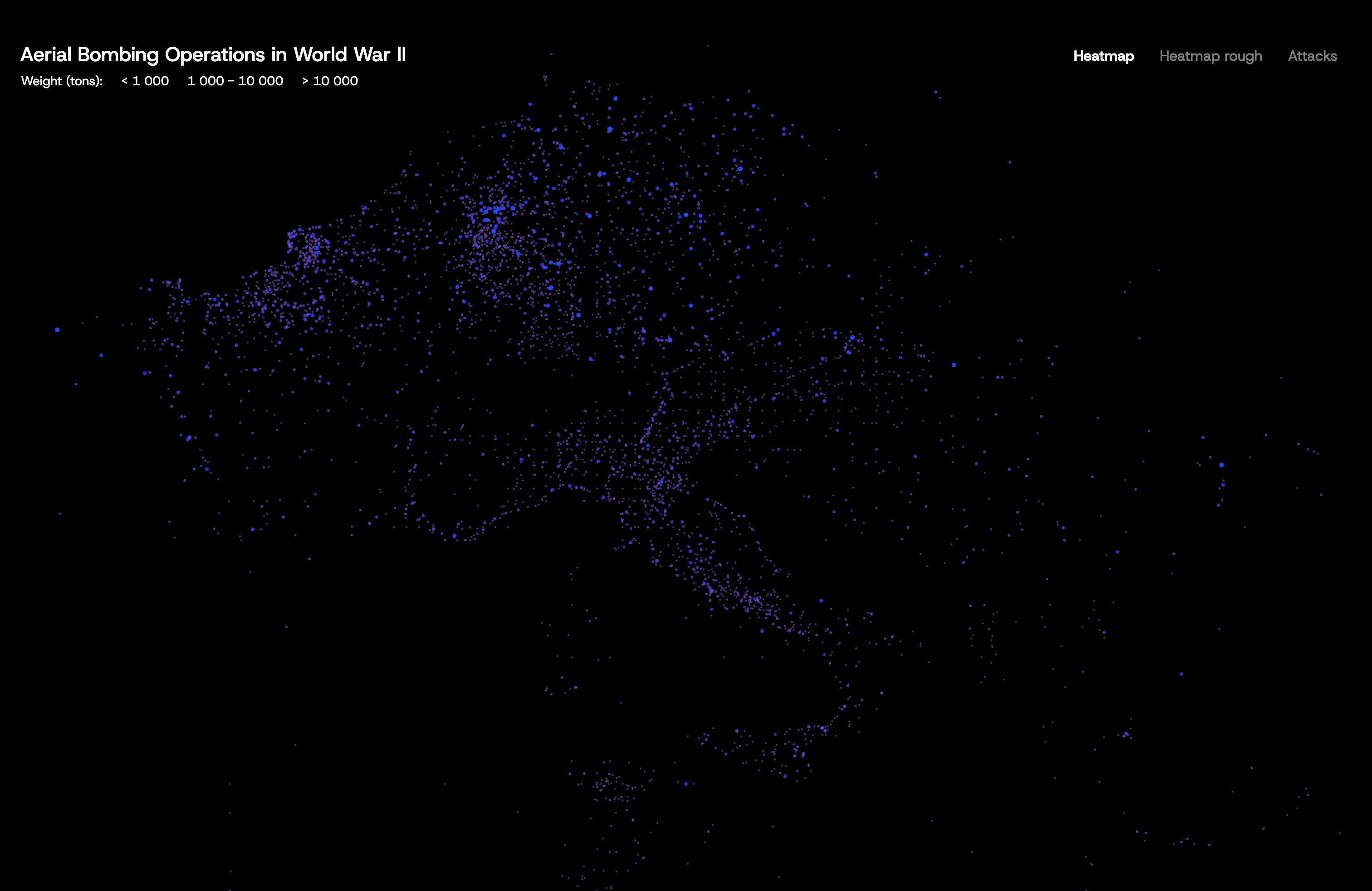 Bei dieser Heatmap sieht man gerade im Vergleich zur detaillierteren Heatmap die Bereiche, in denen generell viel bombardiert wurde, anstatt nur kleine Punkte. Diese waren häufig Hauptstädte oder andere wichtige Kriegsziele.