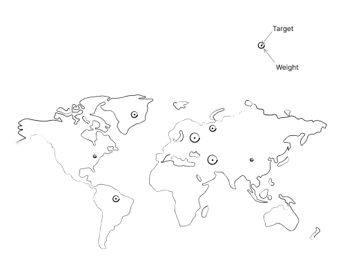 Somit lag nahe, dass ich eine Art Balkendiagramm machen werde, bei dem die 5 Countries unten nebeneinander angeordnet sind. Oberhalb dieser Balken sind dann die Balken der Target Countries. Die Höhe der Balken wird durch die Anzahl bestimmt, wie oft sie angegriffen wurden. Das geschah prozentual an den Target Countries der USA. Denn diese hatten die mit Abstand höchsten Werte und bildeten somit den Maßstab für die Höhe der Target Countries anderer Länder.