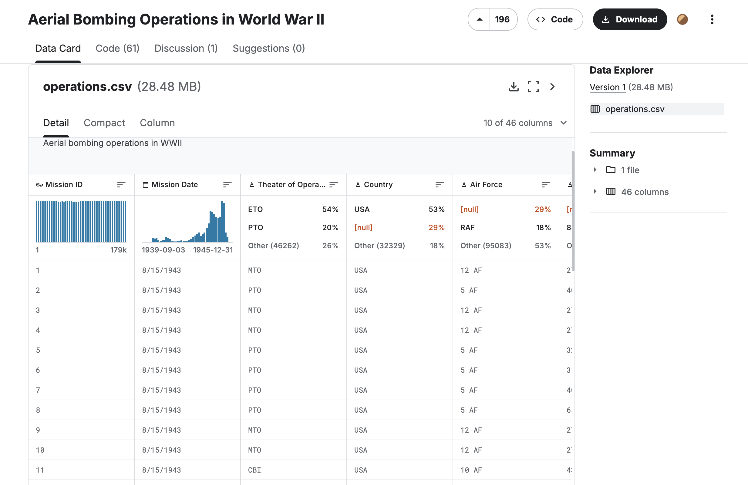 Ich habe mir für die Datenvisualisierung im Kurs Programmiertes Entwerfen 2 zu Beginn des Projekts mehrere Datensätze herausgesucht. Meine endgültige Auswahl fiel dann auf den Datensatz “Aerial Bombing Operations in WW2”, welcher mit grob 180 000 Zeilen und 46 Spalten erst sehr umfangreich erschien. Doch wie sich später herausstellte, fehlte in vielen Spalten ein Großteil der Daten.