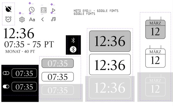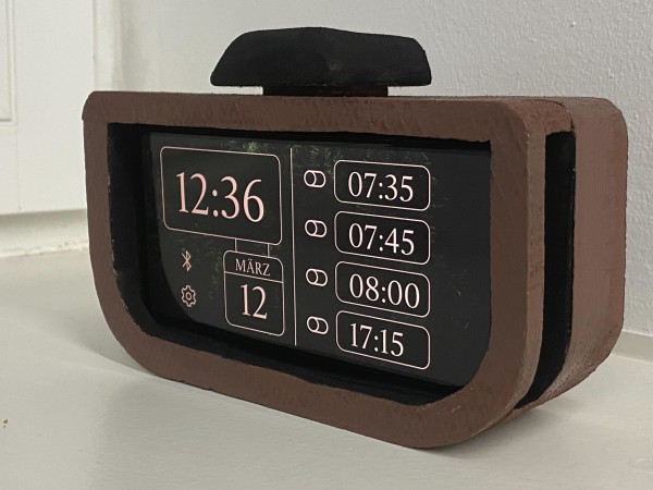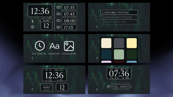 Der entstandene Wecker erlaubt es, bis zu vier unterschiedliche Weckzeiten individuell festzulegen und übersichtlich anzeigen zu lassen. Neben der reinen Zeitfunktion stand besonders die visuelle Anpassbarkeit im Fokus: Die Nutzerin kann das Erscheinungsbild ihres Weckers personalisieren, etwa durch die Wahl eines individuellen Hintergrunds oder gestalterischer Elemente. So entstand ein Wecker, der nicht nur weckt, sondern auch visuell anspricht und sich flexibel an persönliche Vorlieben und Bedürfnisse anpasst.