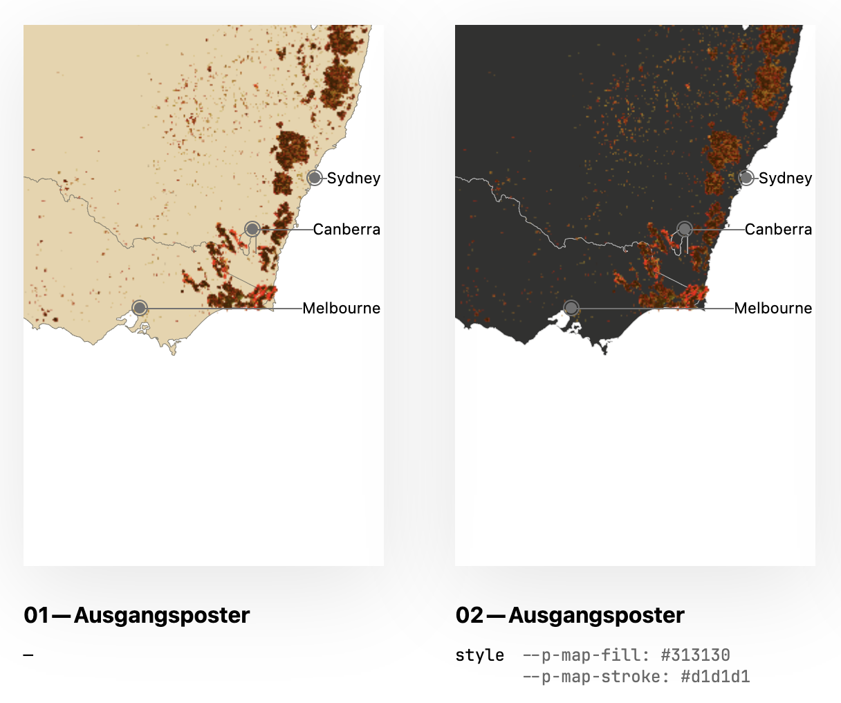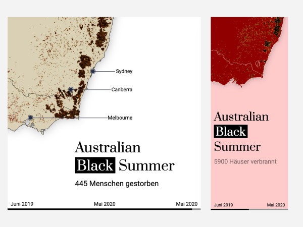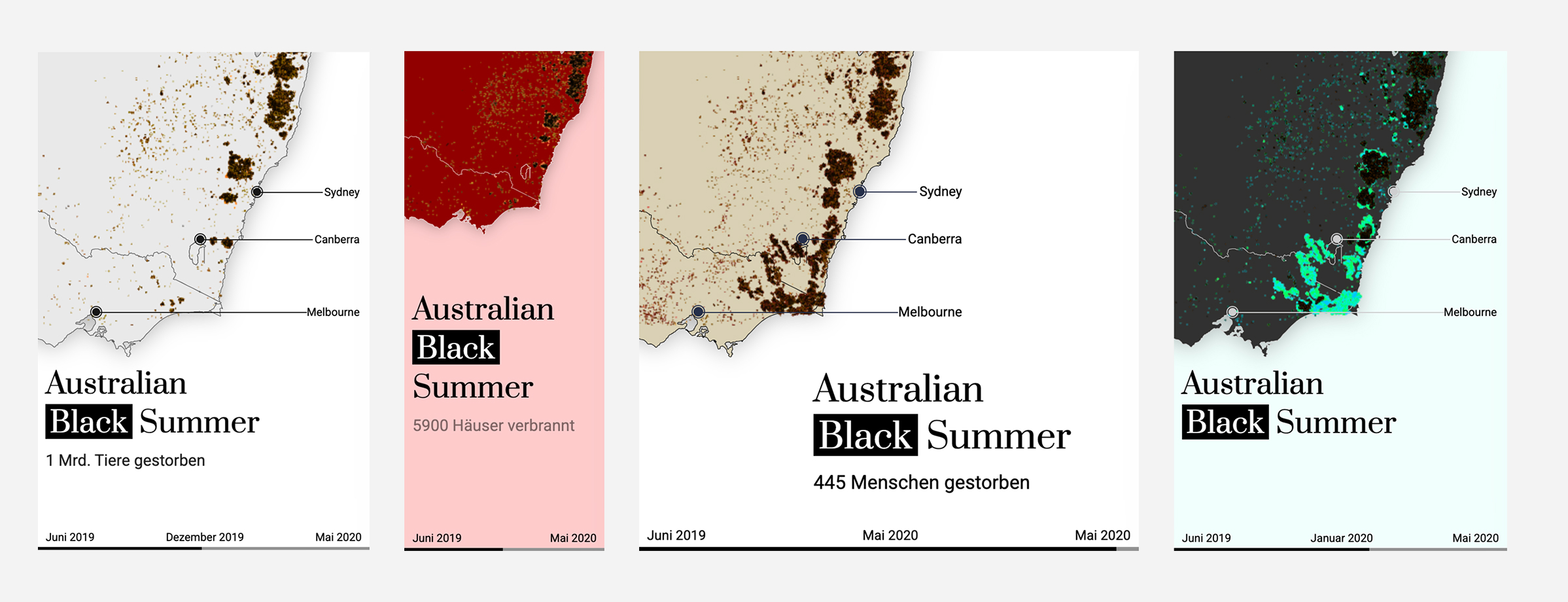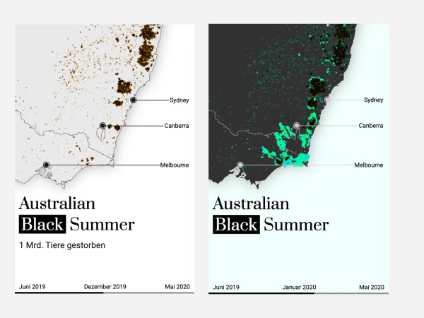 Das Projekt “Australian Black Summer” visualisiert die verheerenden Buschbrände in den australischen Regionen Victoria und New South Wales während der Black Summer Saison 2019-2020 mit dem Ziel, das Bewusstsein für die verheerenden Auswirkungen des Klimawandels zu schärfen. Im Fokus steht die Darstellung dieser Waldbrände, die zu den schlimmsten Naturkatastrophen in der australischen Geschichte zählen.