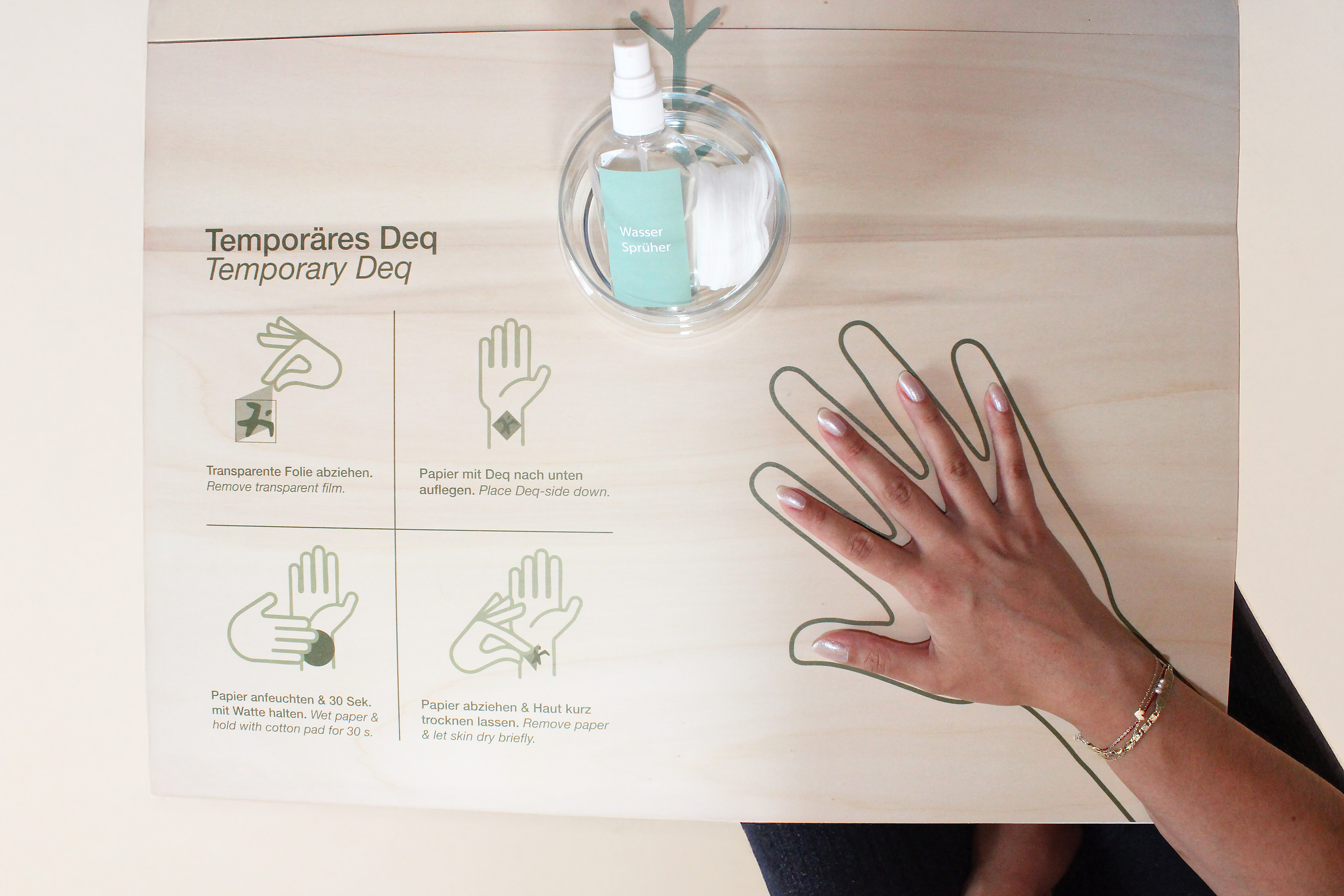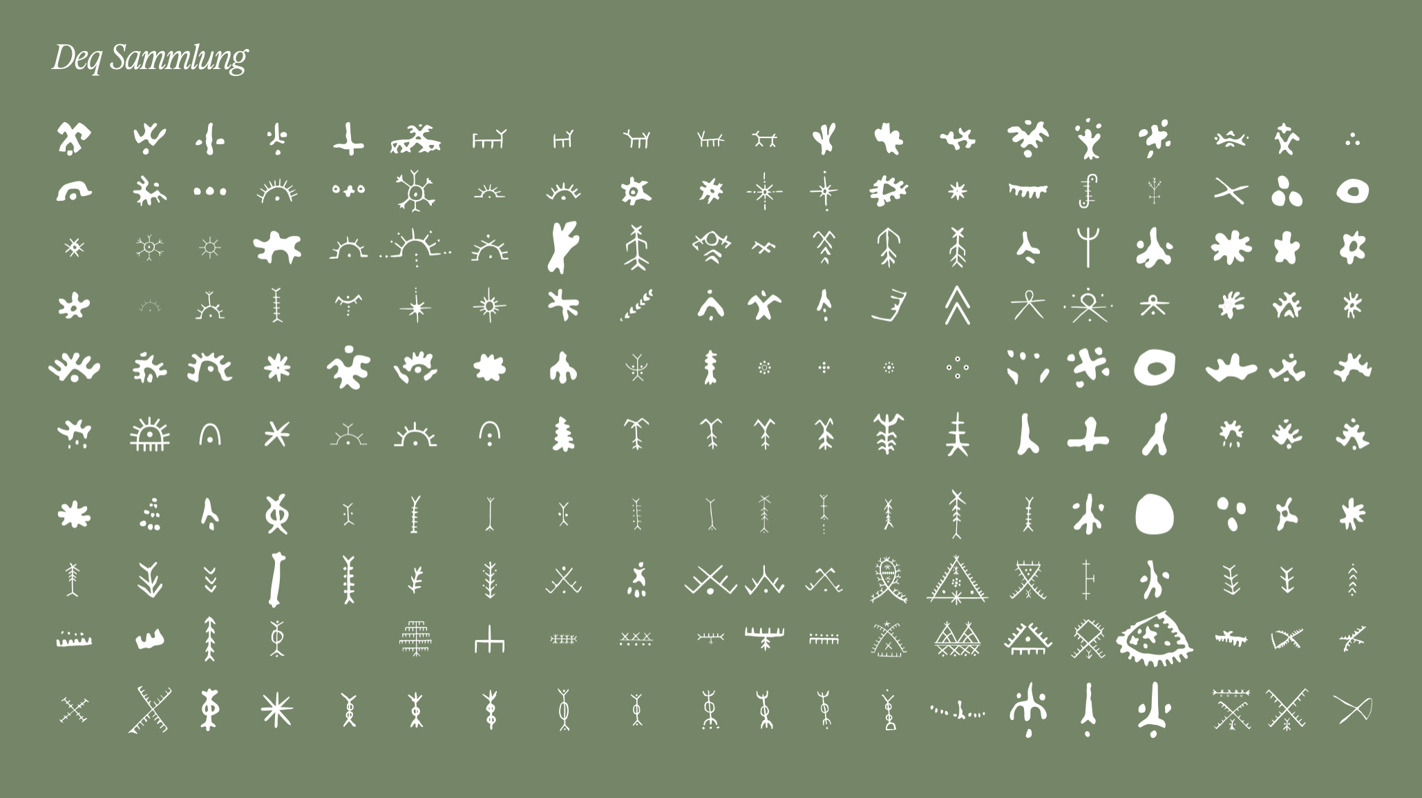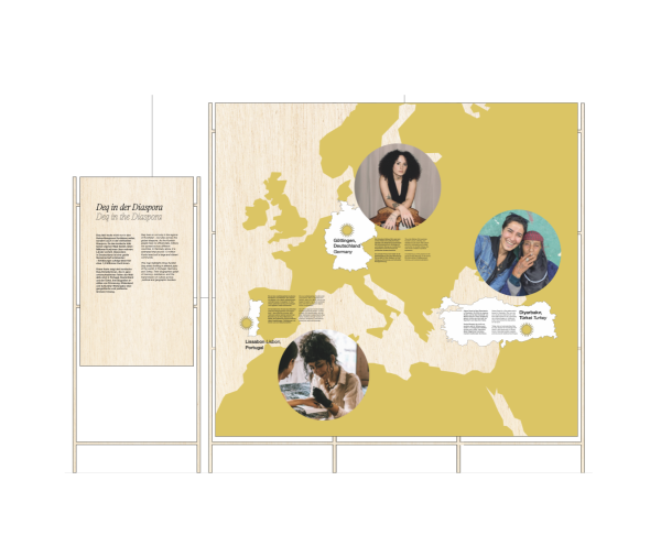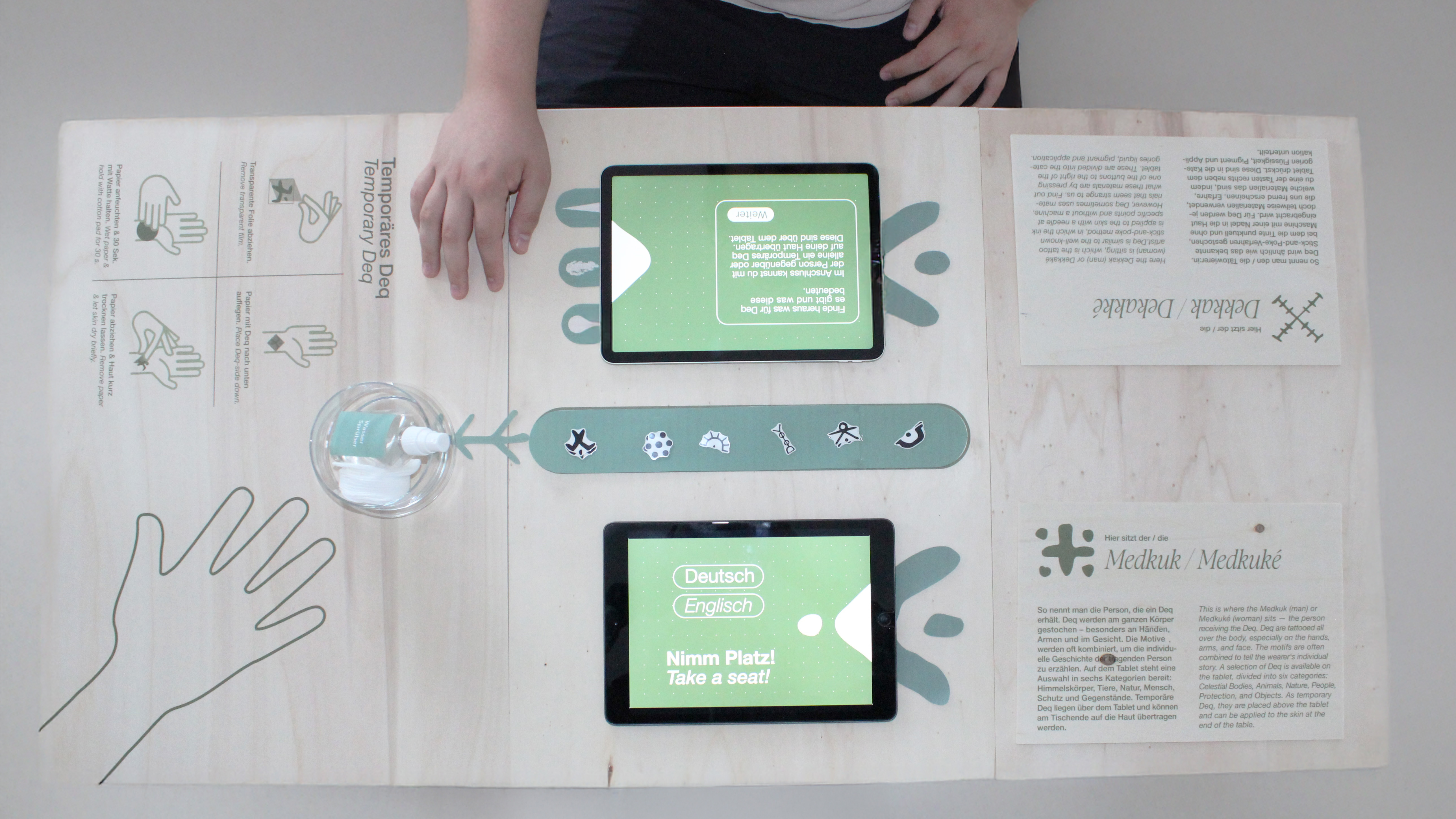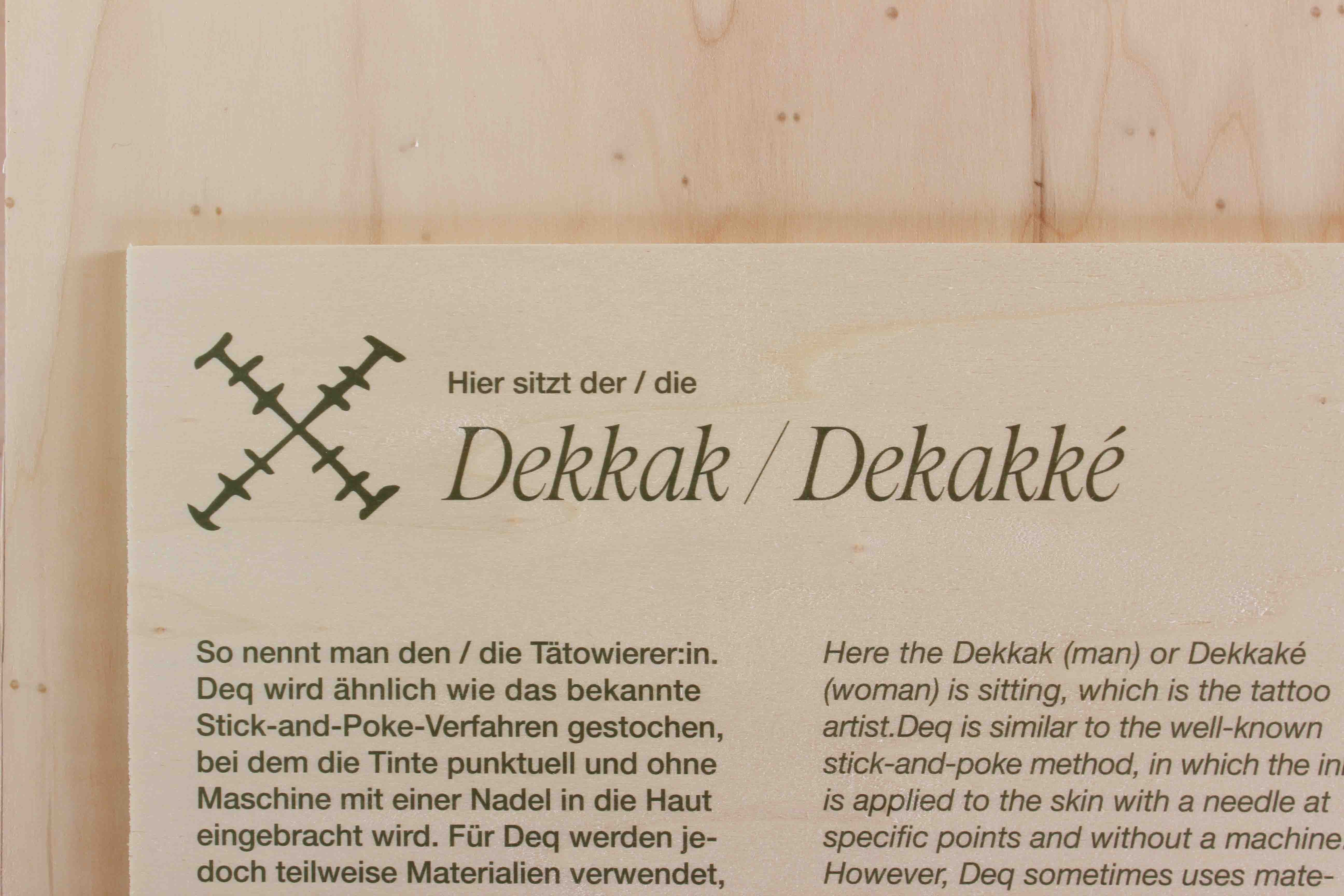 Die Ausstellung gliedert sich in verschiedene Stationen, die Materialien, Motive, Techniken, Rollenbilder und Mythen rund um Deq beleuchten. Zentraler Bestandteil ist ein interaktiver Tisch mit Tablets, an dem Besucher:innen die Materialien digital erkunden und sich selbst ein temporäres Deq auftragen können. Ergänzt wird die Ausstellung durch originale Tierpräparate, historische Objekte, künstlerische Arbeiten und Interviews mit zeitgenössischen kurdischen Tätowierer:innen. Dabei wird deutlich: Deq ist nicht nur ein visuelles Zeichen, sondern auch Ausdruck von Identität, Widerstand und Selbstermächtigung – besonders in der kurdischen Diaspora.