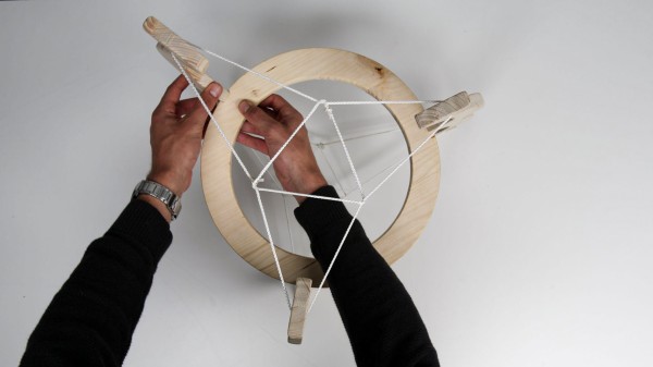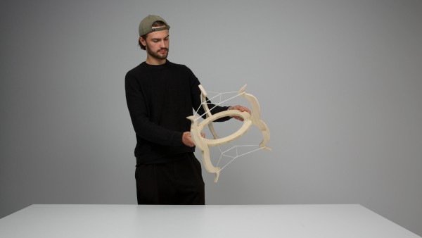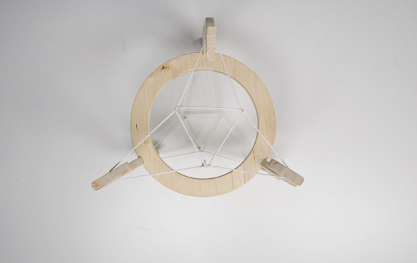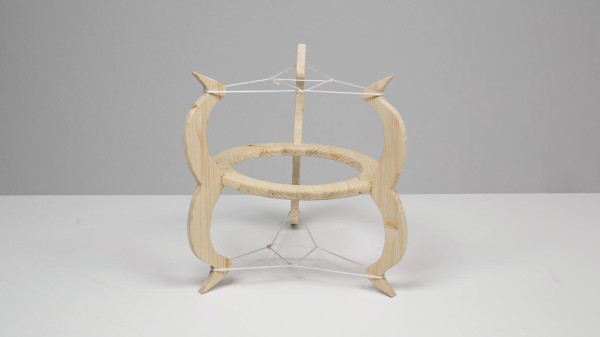 Das Objekt soll durch seine Form und Mittelachse den Blick ins Zentrum lenken und wirkt, als würde der Ring schweben. Die Seilzugkonstruktion spart Gewicht, bleibt aber stabil – eine Idee, inspiriert von Frei Otto und Kenneth Snelson. Drei Balken halten die Schnüre sicher, scharfkantige Formen erinnern an eine Krone. Zwei Bögen verstärken die Illusion von Spannung. Oben und unten wird das Objekt durch Verspannung stabilisiert. Ein zusätzliches gespanntes kleines Seildreieck erhöht die Stabilität und Symmetrie ohne komplizierte Knoten.