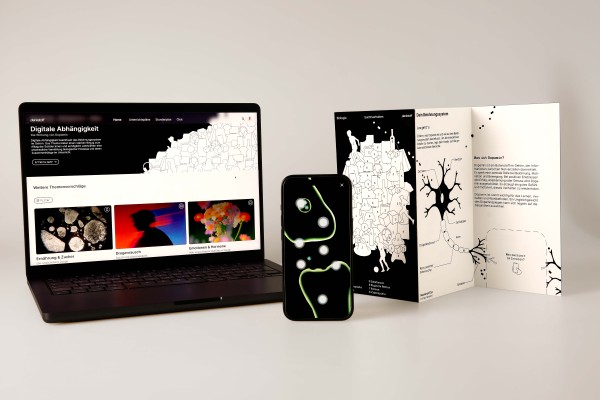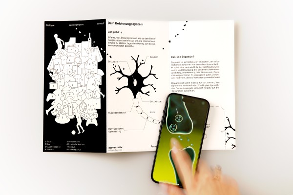 Als Einstieg in das Thema „Digitale Abhängigkeit“ wird im Biologieunterricht eine interaktive Faltbroschüre verwendet. Diese kombiniert analoge Inhalte mit digitalen Elementen – über integrierte NFC-Technologie. Die Broschüre beginnt mit einem Wimmelbild, das verschiedene Formen von Süchten darstellt. Anschließend führt sie in den biologischen Aufbau einer Nervenzelle ein und erklärt, wie der Dopaminprozess im Gehirn zur Entstehung von einer Sucht führen kann.