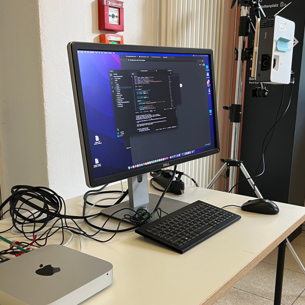 Die Fensterinstallation wird mithilfe eines Beamer als Rückprojizierung auf die Tür geworfen. Über der Tür befindet sich eine kleine Kamera, die mithilfe des Programms “OpenCV” die Gestensteuerung erkennt und in ProtoPie ausführt.