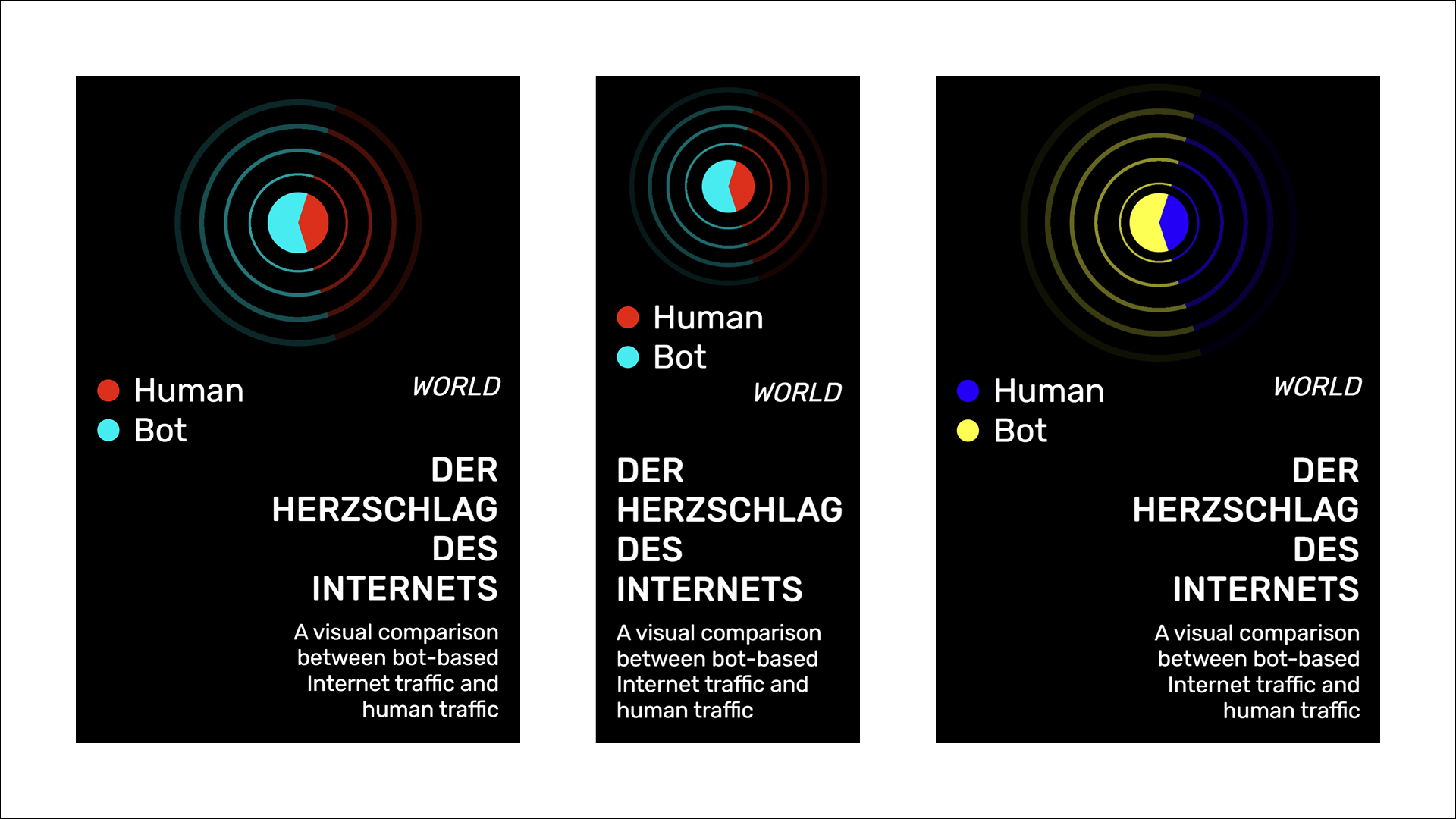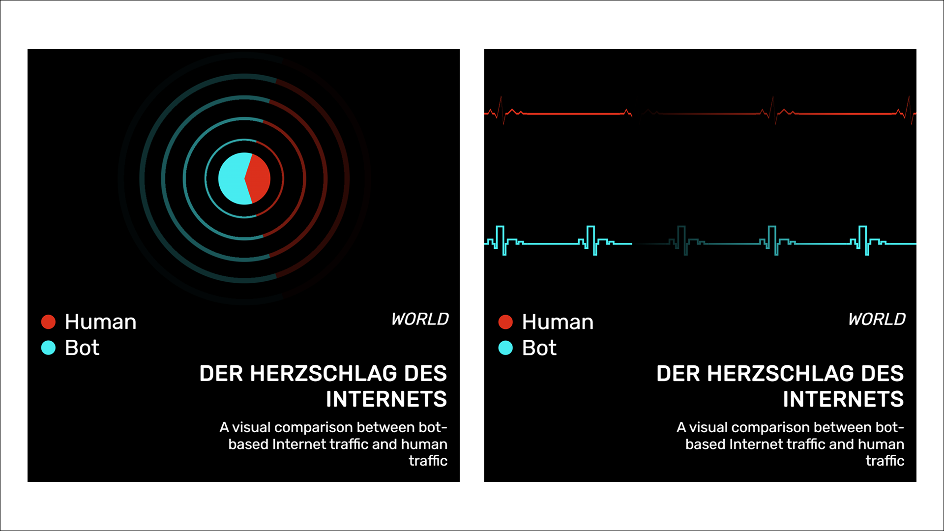 Das Projekt “Der Herzschlag des Internets” visualisiert den globalen Internettraffic aufgeteilt nach menschlichem und Bot-Traffic mit dem Ziel, die Mechanisierung des Internets sichtbar zu machen. Im Fokus steht die metaphorische Darstellung des Internets als lebendigen Organismus, dessen Pulsschlag durch Datenverkehr bestimmt wird. Die interaktive Visualisierung kombiniert eine Herzschlag-Animation mit einer EKG-artigen Darstellung, um das Verhältnis zwischen menschlicher und maschineller Internetnutzung zu verdeutlichen.