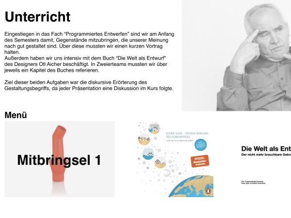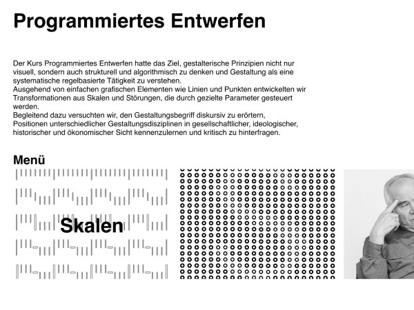 Im Kurs “Programmiertes Entwerfen” haben wir uns das Semester über mit Skalen und Störungen beschäftigt sowie verschiedene Präsentationen gehalten. Dabei standen das programmatische Entwerfen und gestalterische Exploration im Vordergrund. Der Fokus lag also auf unserem persönlichen Erkenntnisgewinn im Prozess des Gestaltens, und nicht auf einer funktionalen Anwendbarkeit der Skalen oder Störungen. Außerdem hatte der Kurs zum Ziel, unterschiedliche Positionen zum Thema Design kennenzulernen und den Gestaltungsbegriff diskursiv zu erörtern.