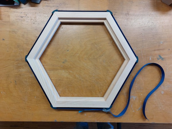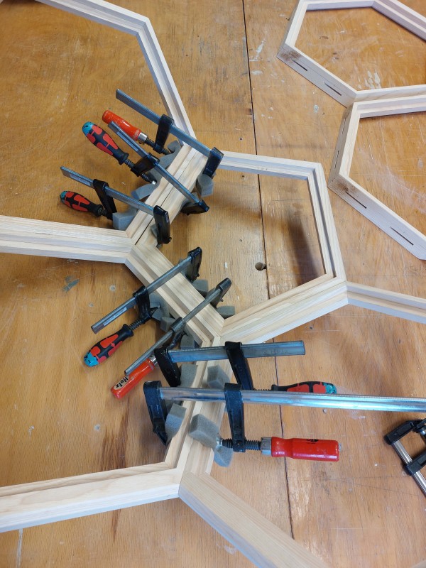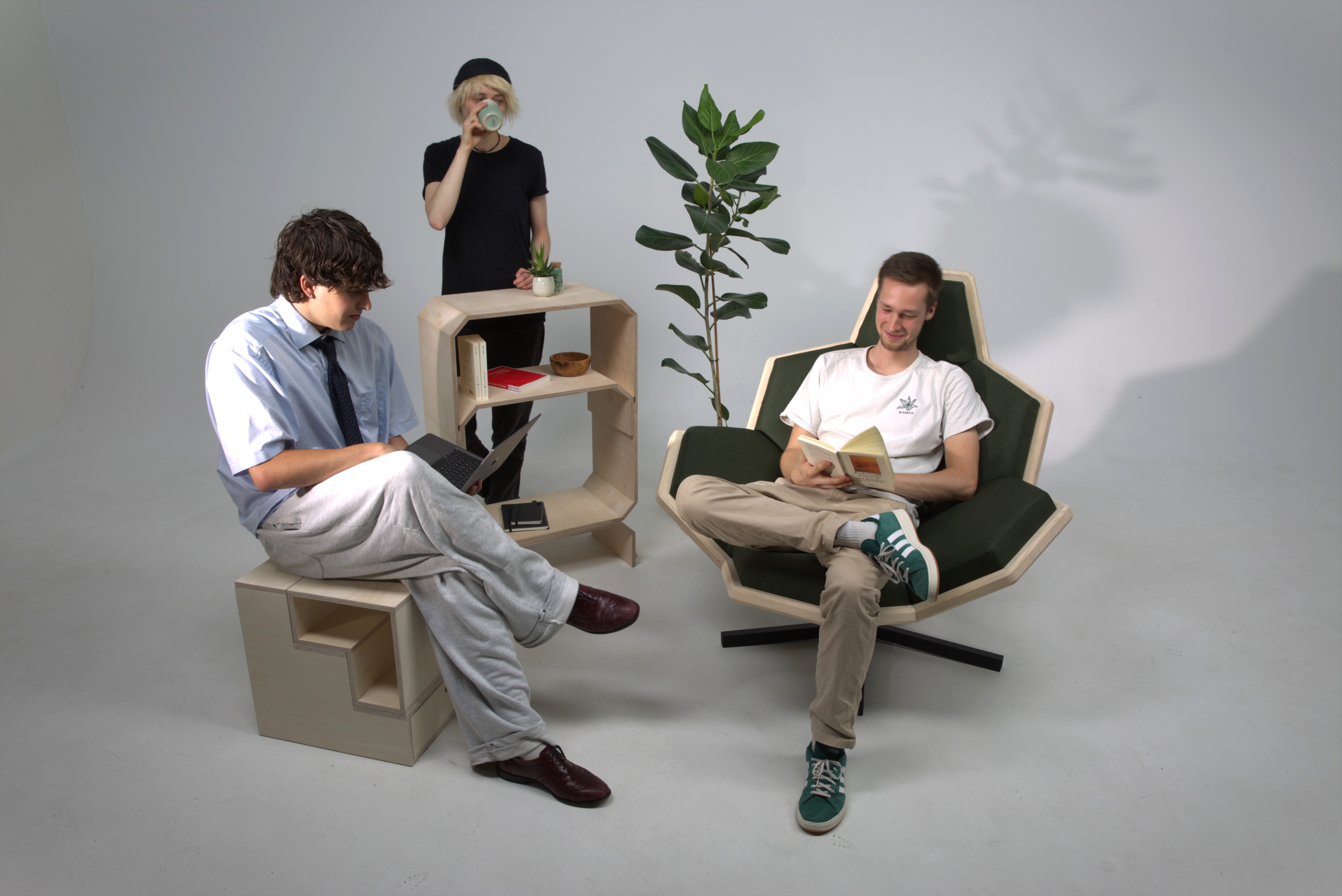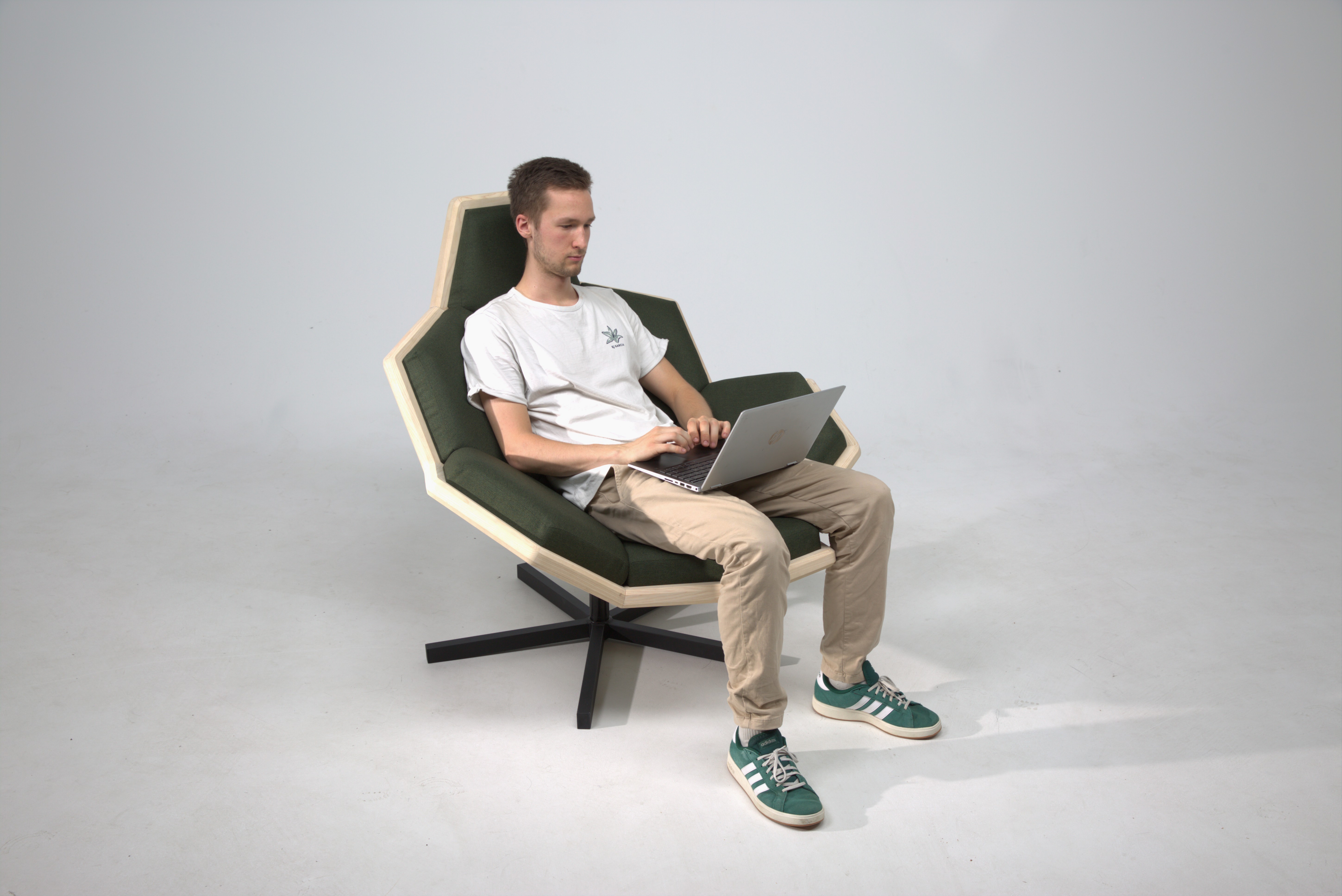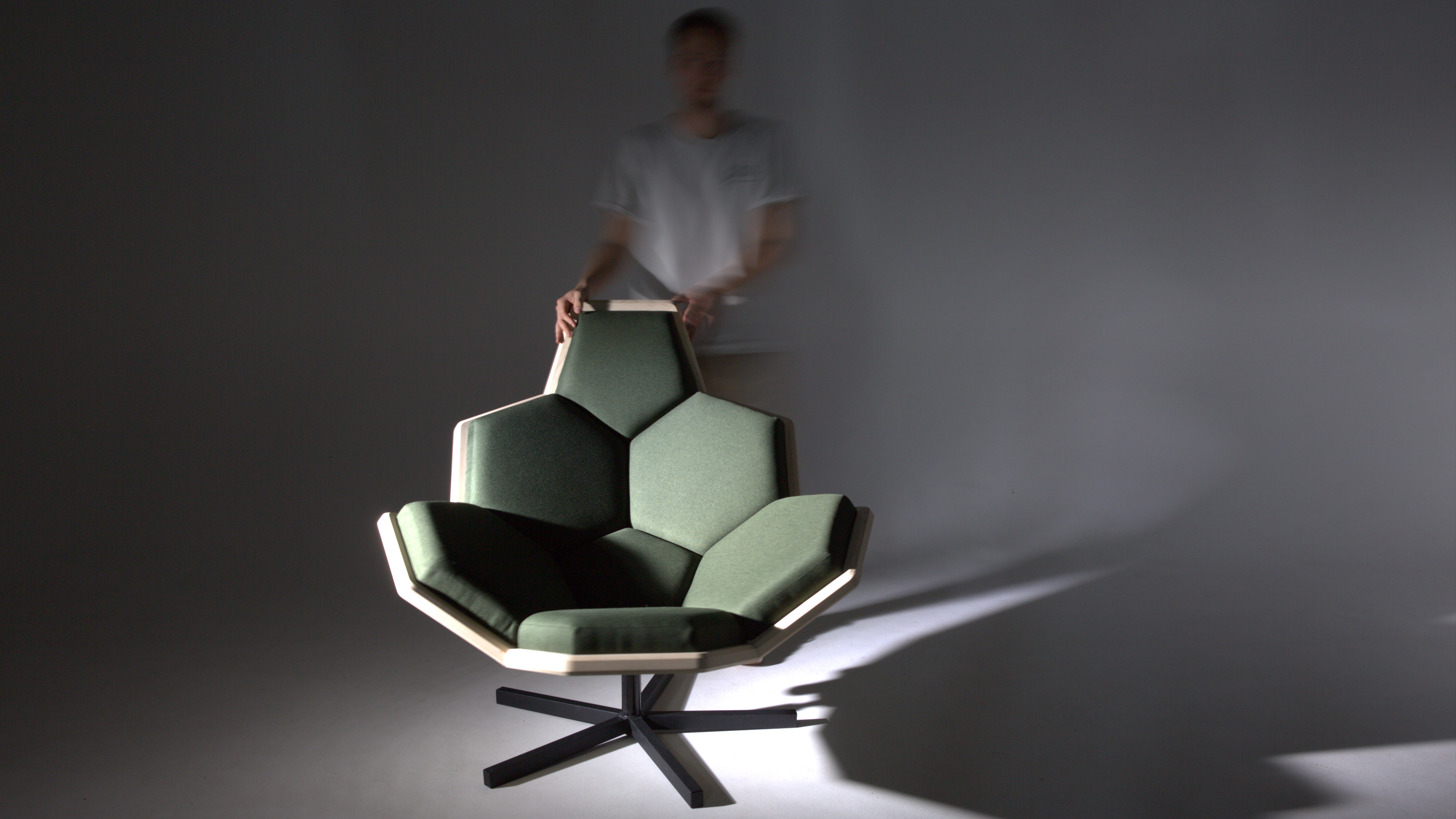 Die Sitzschale, die aus Eschenholz gefertigt wurde, ist ein Ausschnitt eines abgestumpften Ikosaeders. Also eines Körpers, der aus gleichen Sechs- und Fünfecken besteht.