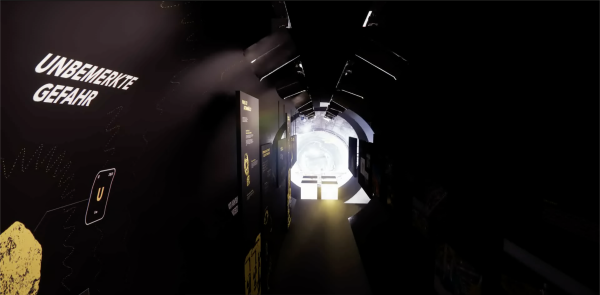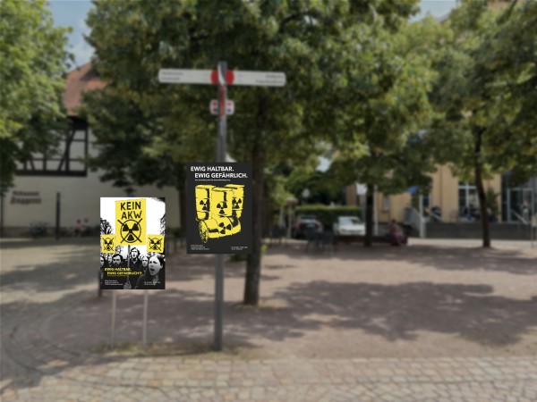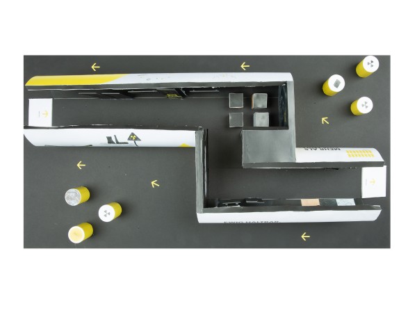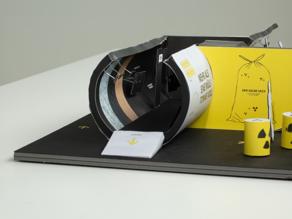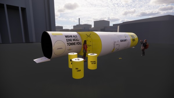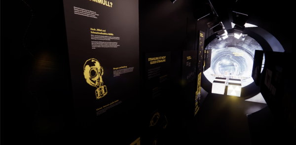 Die Ausstellung besteht aus drei runden Tank-Schiffscontainern, die eine geschlossene, runde Form bilden. Von außen erinnern sie an Endlagerbehältnisse, im Inneren an ein unterirdisches Bergwerk. Plakative Außenwände erzeugen Fernwirkung und wecken Neugier. Ergänzt wird das Außenszenario durch gelbe Metallfässer mit prägnanter Beschriftung und dem typischen Nuklearicon – ein Eyecatcher mit Signalwirkung.
