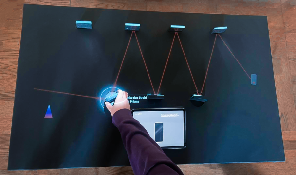 Im Laserexperiment müssen die Spiegel präzise ausgerichtet werden, damit der Laserstrahl seinen Weg durch den Parcours findet. Für jeden richtig platzierten Spiegel erhältst man spannende Einblicke, wo Laser im Alltag stecken – zum Beispiel in Geräten oder bei der Herstellung moderner Technik. Am Ende trifft der Laserstrahl auf ein Prisma und man kann den Laserstrahl mit gewöhnlichem Licht vergleichen.