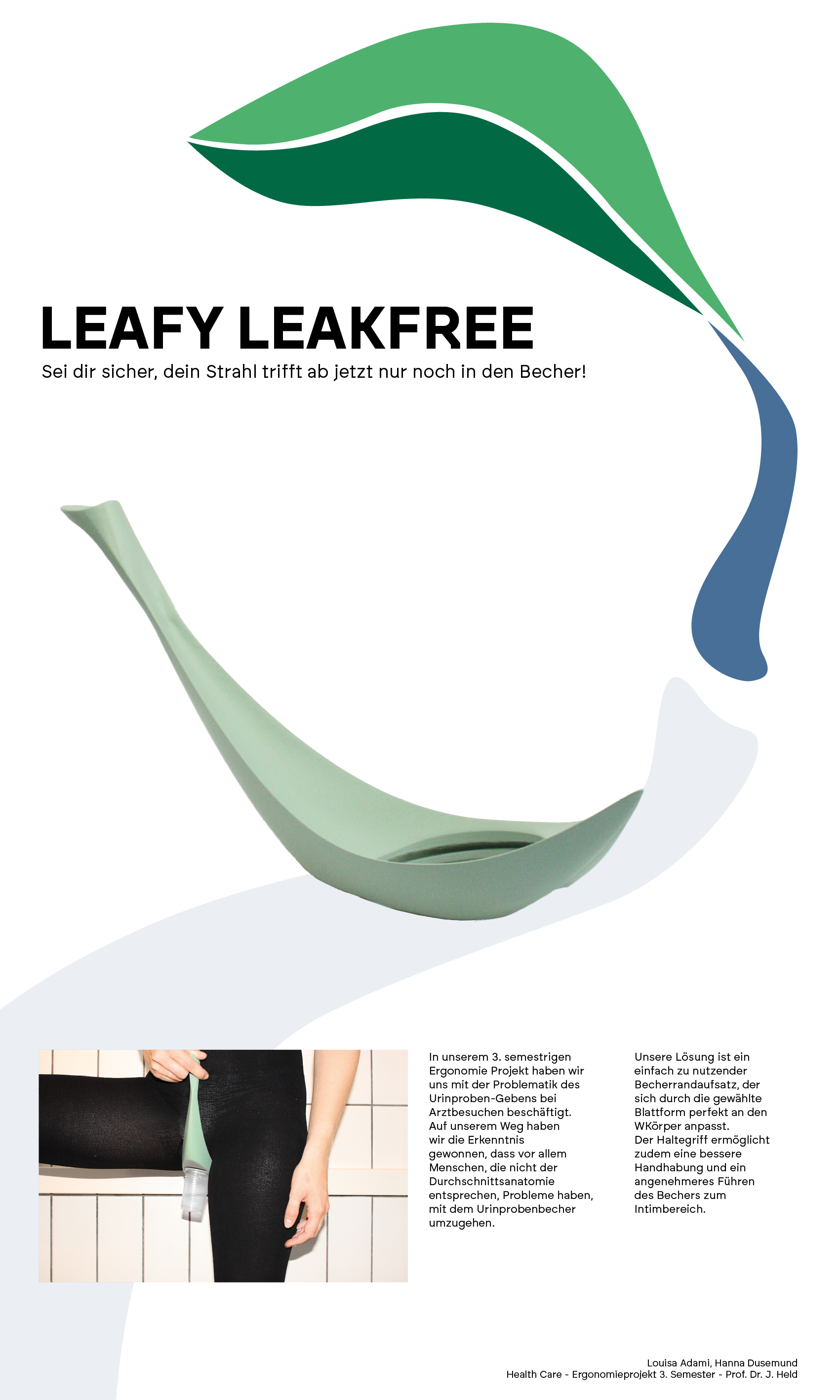 Inhalt des Kurses Ergonomieprojekt Thema: Health Care Es soll ein Produkt für einen der folgenden Bereiche gestaltet werden: Prävention von Krankheiten/Verletzungen medizinische Tätigkeiten/Behandlungen Hilfe bei sensorischen, motorischen, kognitiven Einschränkungen Das Ergonomieprojekt ist ein Semesterprojekt in Verbindung mit der Ergonomie-Vorlesung. Vorgehensweise im Projekt: Suche nach Problembereichen Untersuchung von Anwendungskontexten und Prozessen Analyse bestehender Lösungen Suche nach Produktideen Erstellen einer Anforderungsliste Konzeption von Lösungsvarianten und Vormodellen Zwischenpräsentation, Konzeptentscheidung Entwurf, Ausarbeitung und Modellbau M1:1 Erprobung des Entwurfs im Anwendungskontext Optimierung und weitere Ausarbeitung Dokumentation und Präsentation der Ergebnisse Bachelor of Arts Produktgestaltung Semesterjahr 3. Semester Betreuung Prof. Dr. habil. Jürgen Held Leafy Leakfree Leafy bietet durch den einfachen Einschub des Bechers eine angenehme Handhabung. 0 Studierende Hanna Dusemund, Louisa Adami Betreuung Prof. Dr. habil. Jürgen Held Tags Ergonomie Medizin Weitere Projekte aus diesem Kurs EasySpike Annabell Lennartz, Lennard Schnepf Ondo Mareike Zickgraf, Mare Reichl BlisterGo Vivien Root, Larissa Wernert MaSe-MazeSense Lina Deigentasch, Nina Laudert FreeStride - frei bewegen sicher stützen Joshua Gulde, Johanna Mueller Serano Finn Eger, Laurin Tagliamonte TUK Anton Jost, Melissa Grau (klammer) Lisa Haase quickAID Benjamin Stengel, Nils Maurer FlexiCare Marius Theiss, Daniela Ciochina