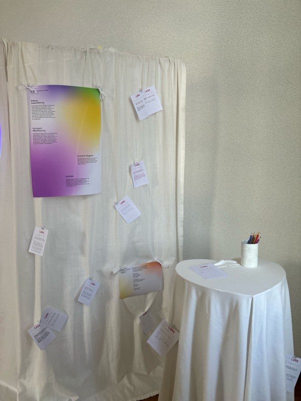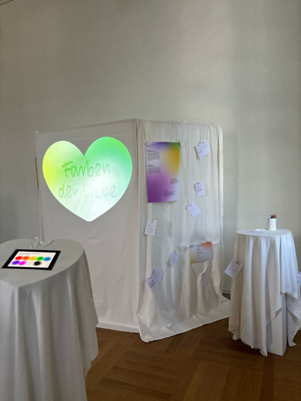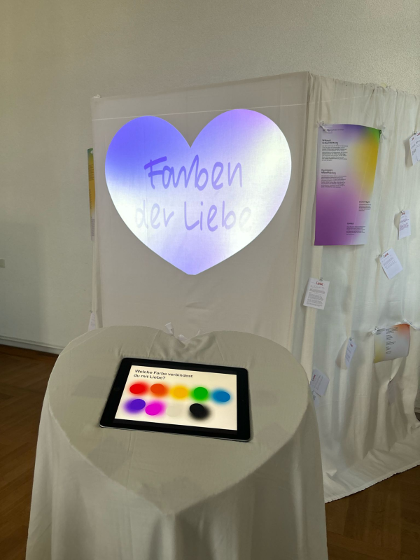 Nicht nur übergeordnete Kulturkreise verbinden unabhängig voneinander verschiedenste Farben mit der Liebe. Auch einzelne Personen können hierzu ganz eigene Assoziationen haben. Deshalb haben wir zudem eine Mitmachstation eingebaut, an der man anonym teilen kann, welche Farbe man mit Liebe im eigenen persönlichen Leben verbindet.
