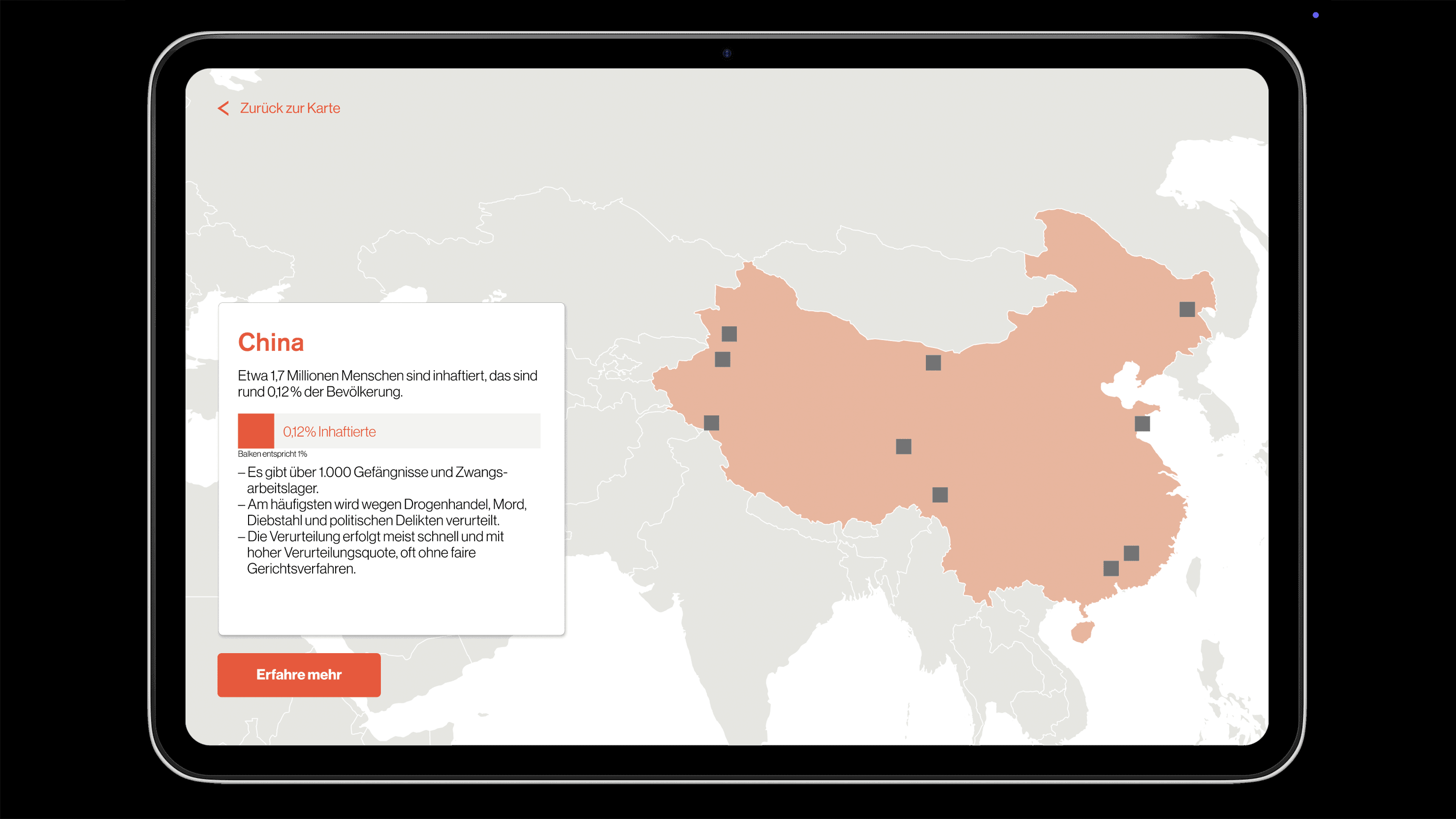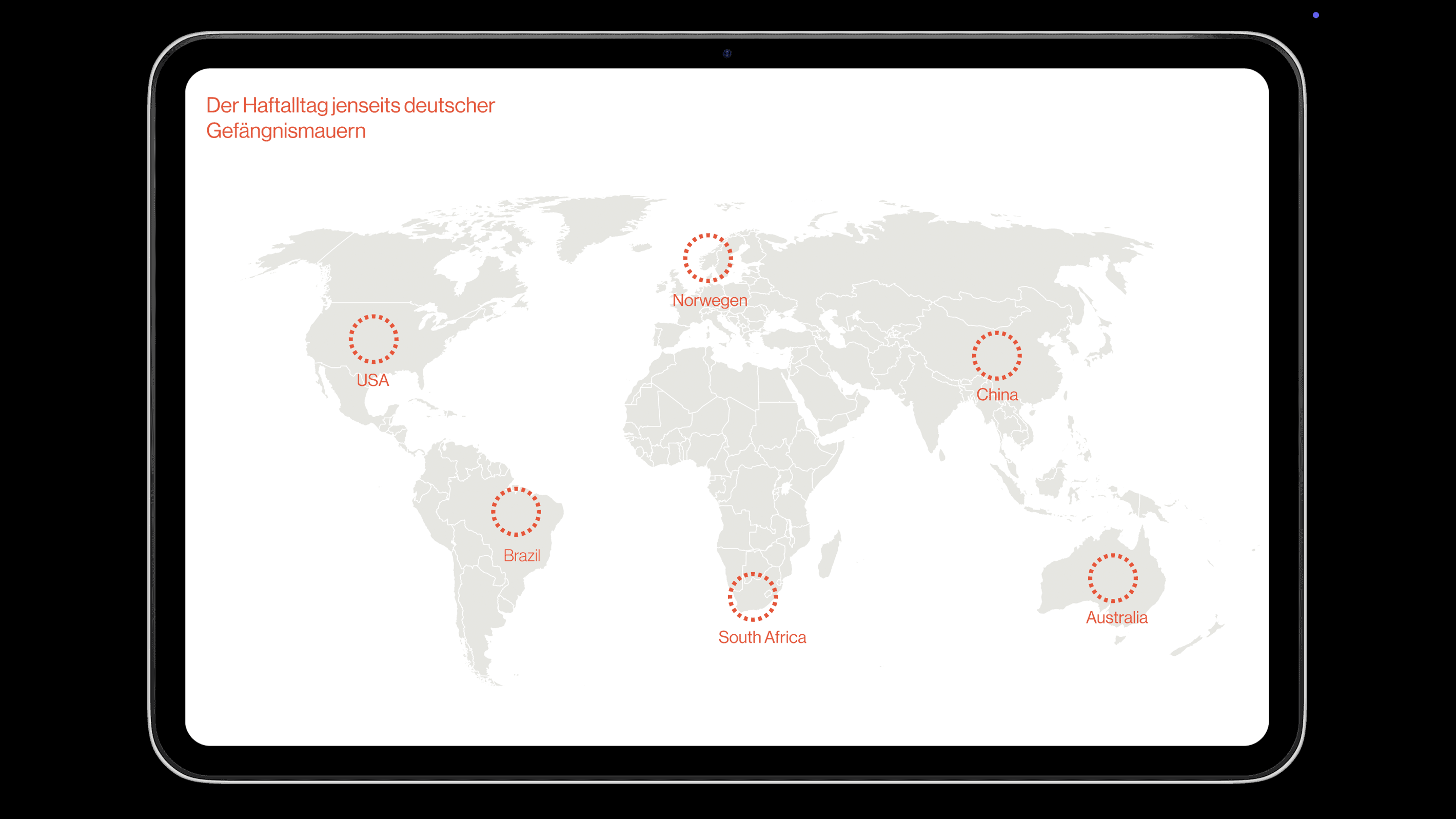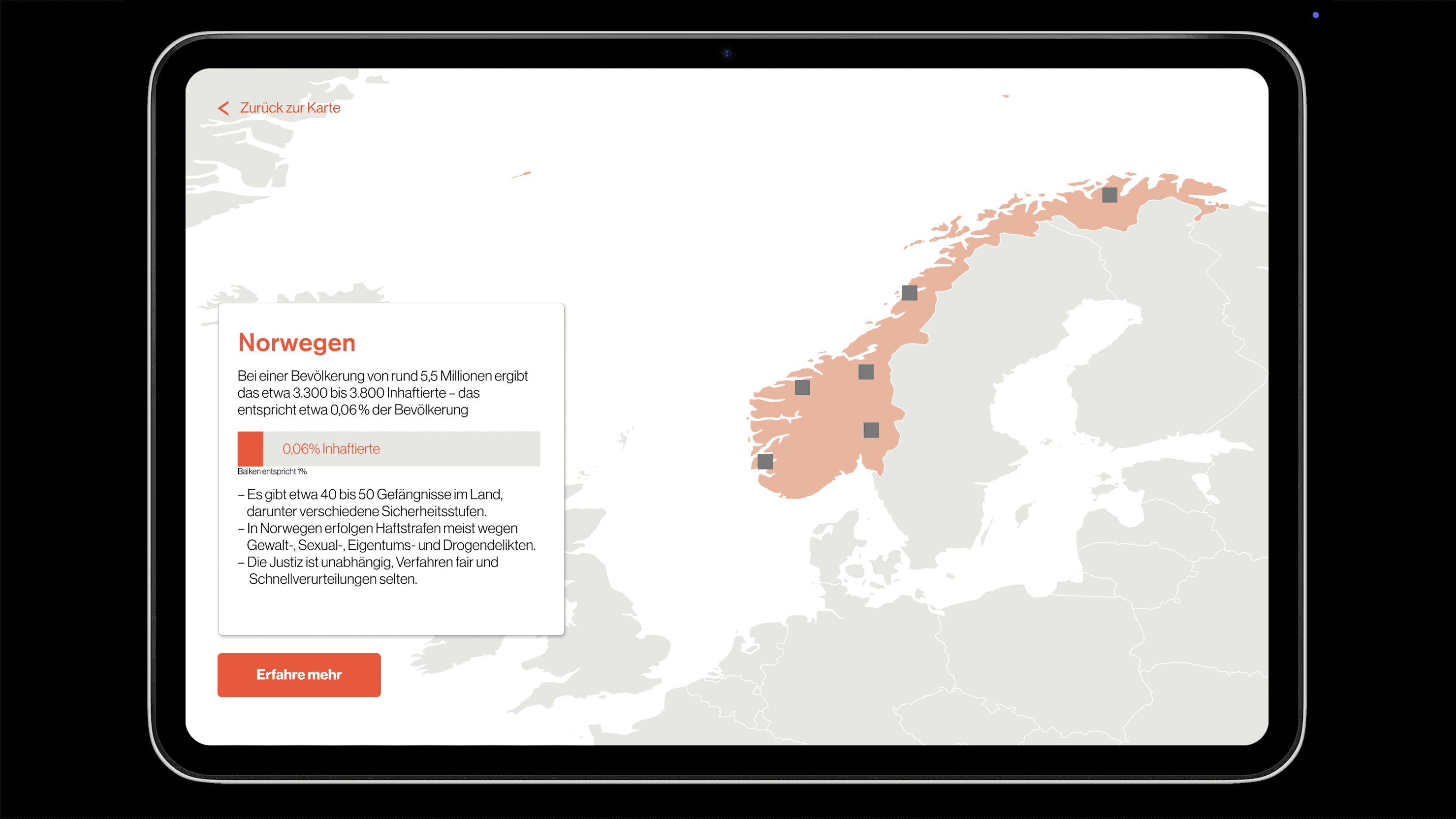 Unsere Tablet-Anwendung ermöglicht einen interaktiven Vergleich der Gefängnissysteme in Norwegen und China. Über eine Weltkarte kann man gezielt eines der beiden Länder auswählen und anschließend durch eine visuell aufbereitete Oberfläche mit Bildern, Piktogrammen und erklärenden Texten scrollen. Der starke Kontrast zwischen beiden Systemen wird dabei anschaulich und intuitiv erfahrbar gemacht.