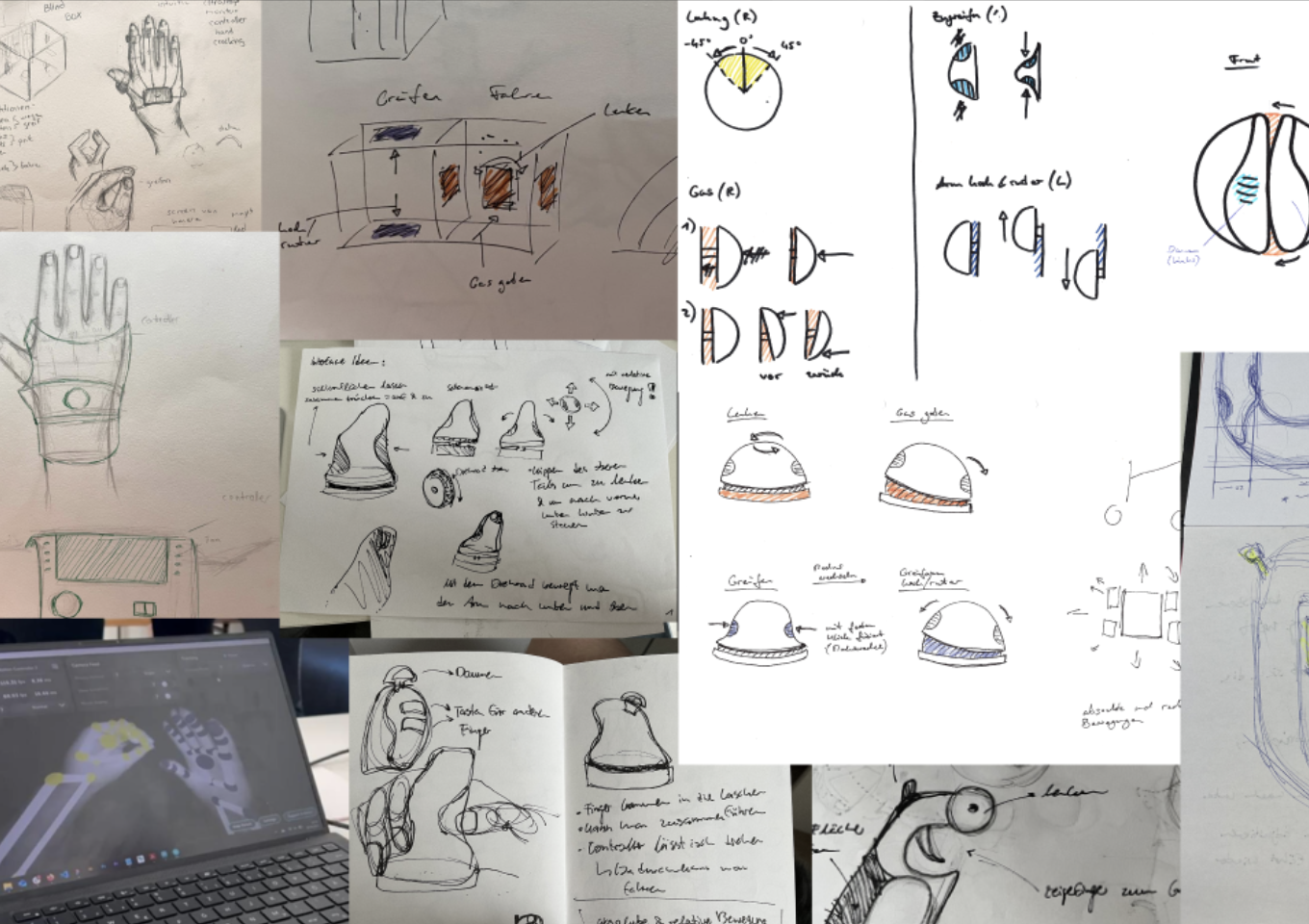 Bereits in den ersten Skizzen entwickelte sich die Idee, die Funktionen „Fahren“ und „Greifen“ klar voneinander zu trennen – sowohl funktional als auch haptisch. Deshalb entschieden wir uns, die Steuerung auf beide Hände aufzuteilen. Auf dieser Grundlage entstanden verschiedene Entwürfe.