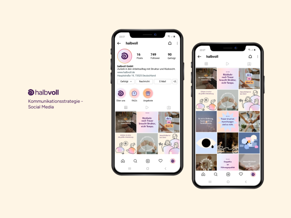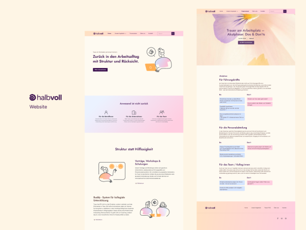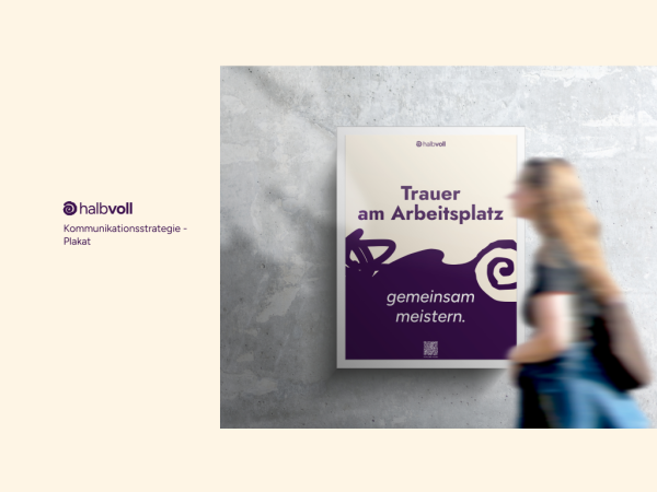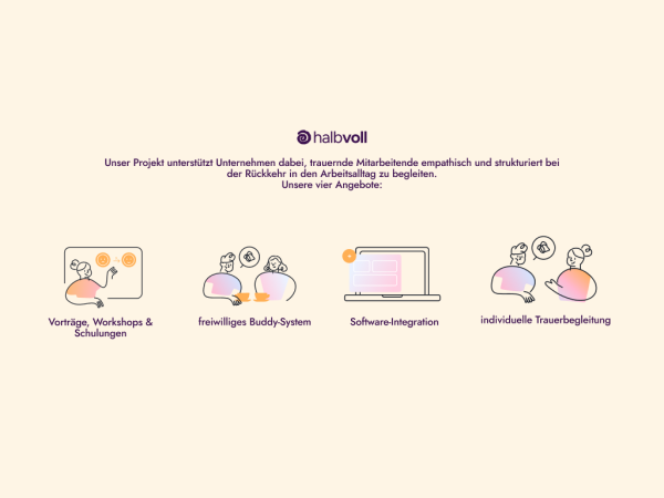 Unser Projekt „Halbvoll“ adressiert die strukturelle Leerstelle im Umgang mit Trauer am Arbeitsplatz. Ziel war es, Unternehmen konkrete, integrierbare Strategien zur Entlastung trauernder Mitarbeitender an die Hand zu geben. Unsere Lösung besteht aus einem modularen System, das Prävention, Begleitung und digitale Unterstützung vereint:
