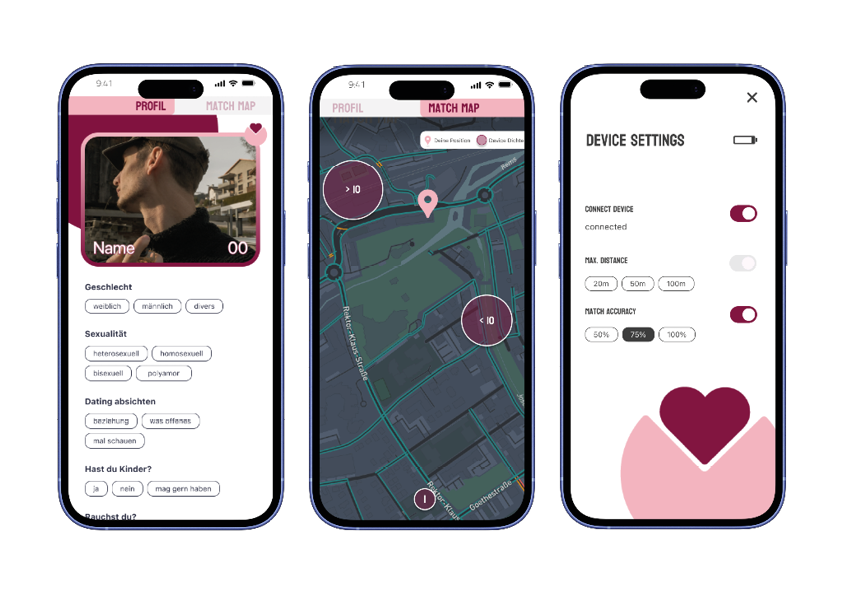 Wie der Name schon verrät, handelt es sich hierbei um eine Dating App, die mithilfe eines begleitenden Devices, dem Herzklopfer, Menschen das reale Kennenlernen wieder näherbringen soll.
