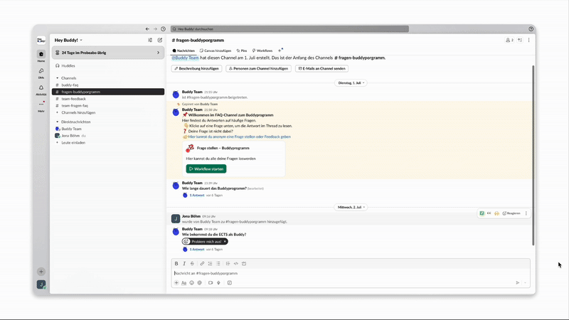 Ein begleitender Slack-Channel bietet Raum für Fragen, Feedback und Austausch – zentral moderiert und kontinuierlich weiterentwickelt.