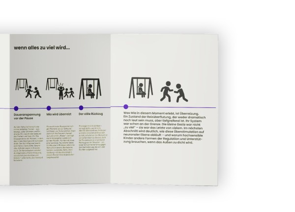 Ziel war es, Hochsensibilität greifbar zu machen – nicht abstrakt, sondern im Alltag verankert. Durch Interviews mit betroffenen Eltern, intensive Recherche und gestalterische Übersetzung entstand ein System aus drei zentralen Bestandteilen: