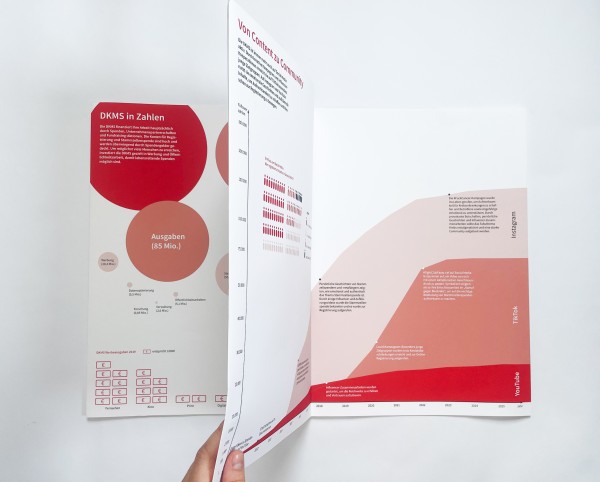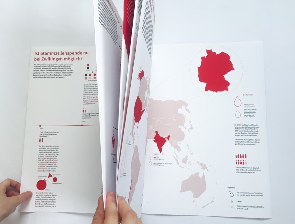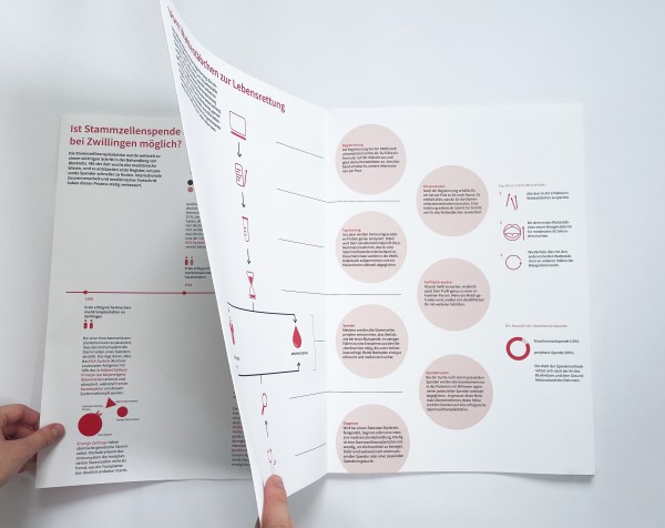Unser Leporello beleuchtet die DKMS aus verschiedenen Perspektiven und erklärt das Prinzip der Stammzellenspende zur Bekämpfung von Blutkrebs. Dazu verwendeten wir verschiedene Diagrammarten und Piktogramme, die uns dabei halfen, unsere Daten anschaulich und verständlich zu visualisieren.