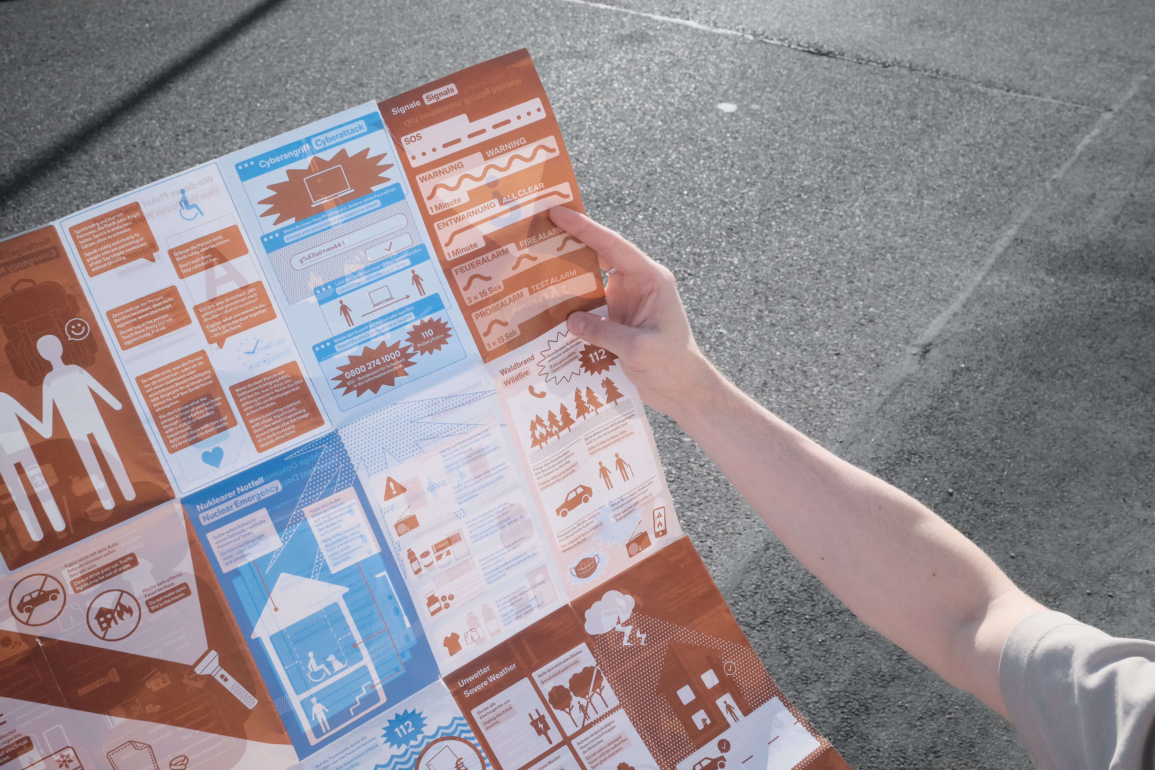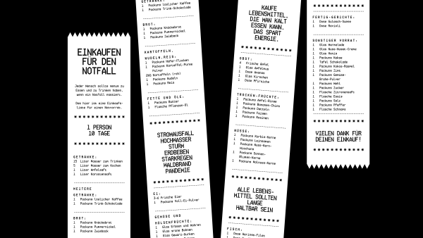 Diese Arbeit besteht aus mehreren Teilen. Wir haben ein digitales Tool für Rettungskräfte gestaltet, um Sprachbarrieren im Einsatz z.B. bei Evakuierungen, Notfällen, etc. zu überbrücken. Zum anderen bringen wir mit unserem Faltplakat Themen wie Selbstwirksamkeit und Eigenvorsorge im Bezug auf Bevölkerungsschutz wieder in den öffentlichen Diskurs. Diese Punkte werden auch im Plakat Feuerlöscher und dem Notfallvorat-Kassenbon thematisiert.
