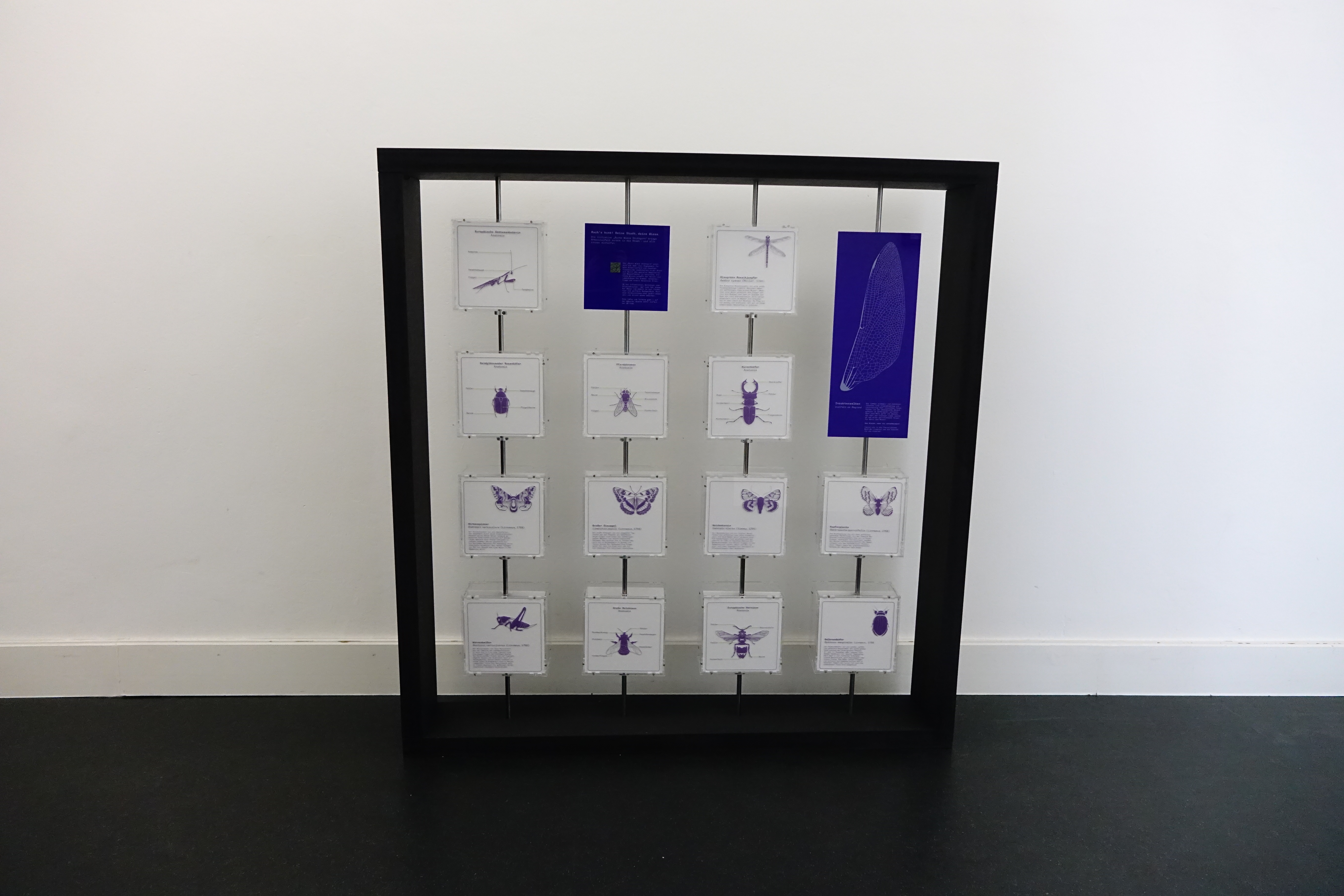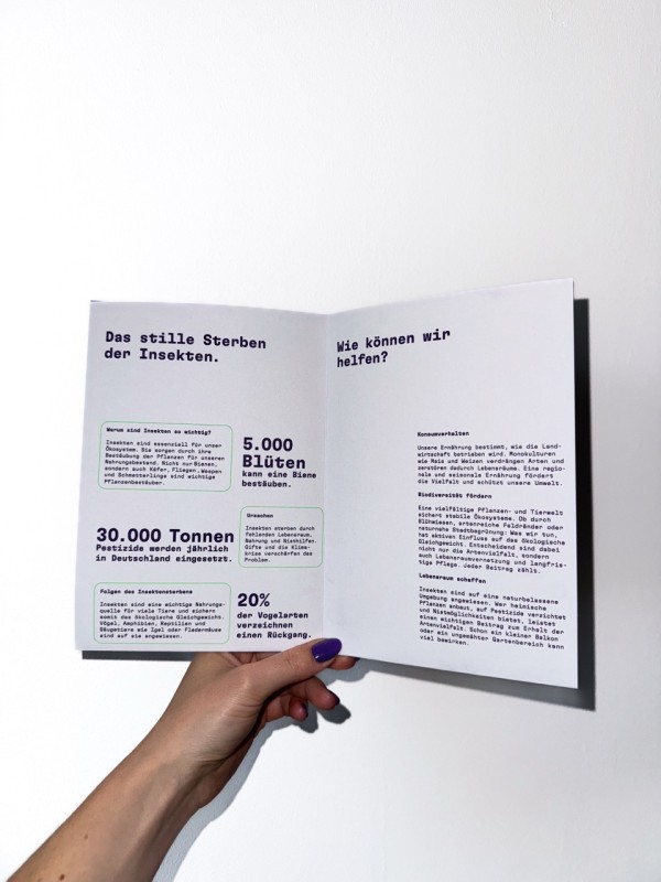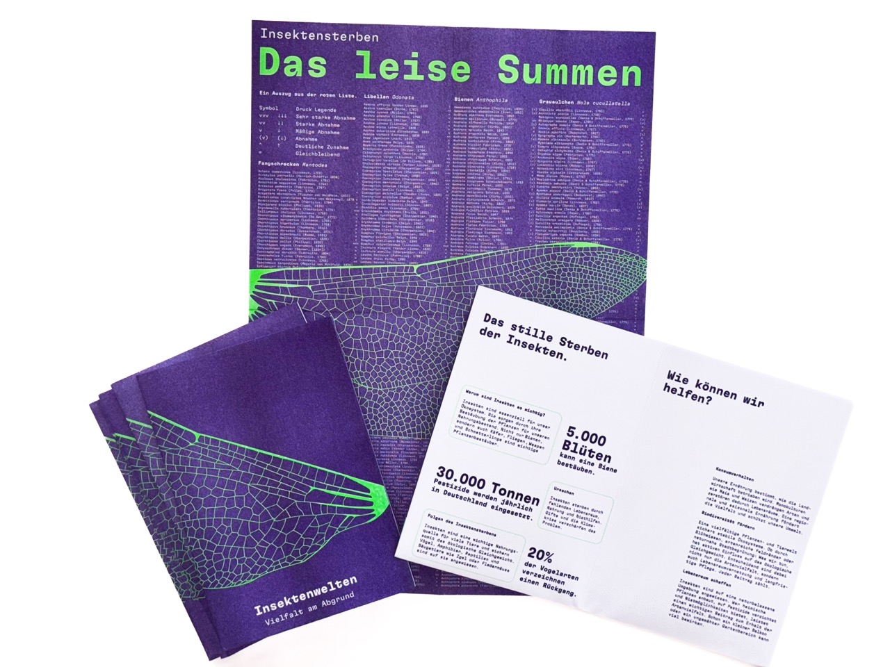 Um den Besucher*innen die Handlungsmöglichkeiten auch für zuhause bereitzustellen, haben wir ein Faltplakat gestaltet. Auf dem Poster befinden sich Ausschnitte aus der roten Liste des Bundesamts für Naturschutz (BfN). Die Rote Liste dokumentiert den Gefährdungsstatus von Tier-, Pflanzen- und Pilzarten in Deutschland. Darunter auch zahlreiche Insektenarten.