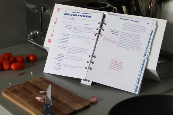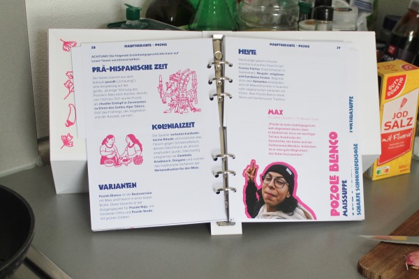 Das Ergebnis ist ein liebevoll gestaltetes A5-Kochbuch mit Ringbindung, das durch Illustrationen, Icons, Portraits, handschriftliche Notizen und begleitende Inhalte wie ein A3-Plakat oder Musik-Playlists zum Kocherlebnis wird – analog, digital und emotional.