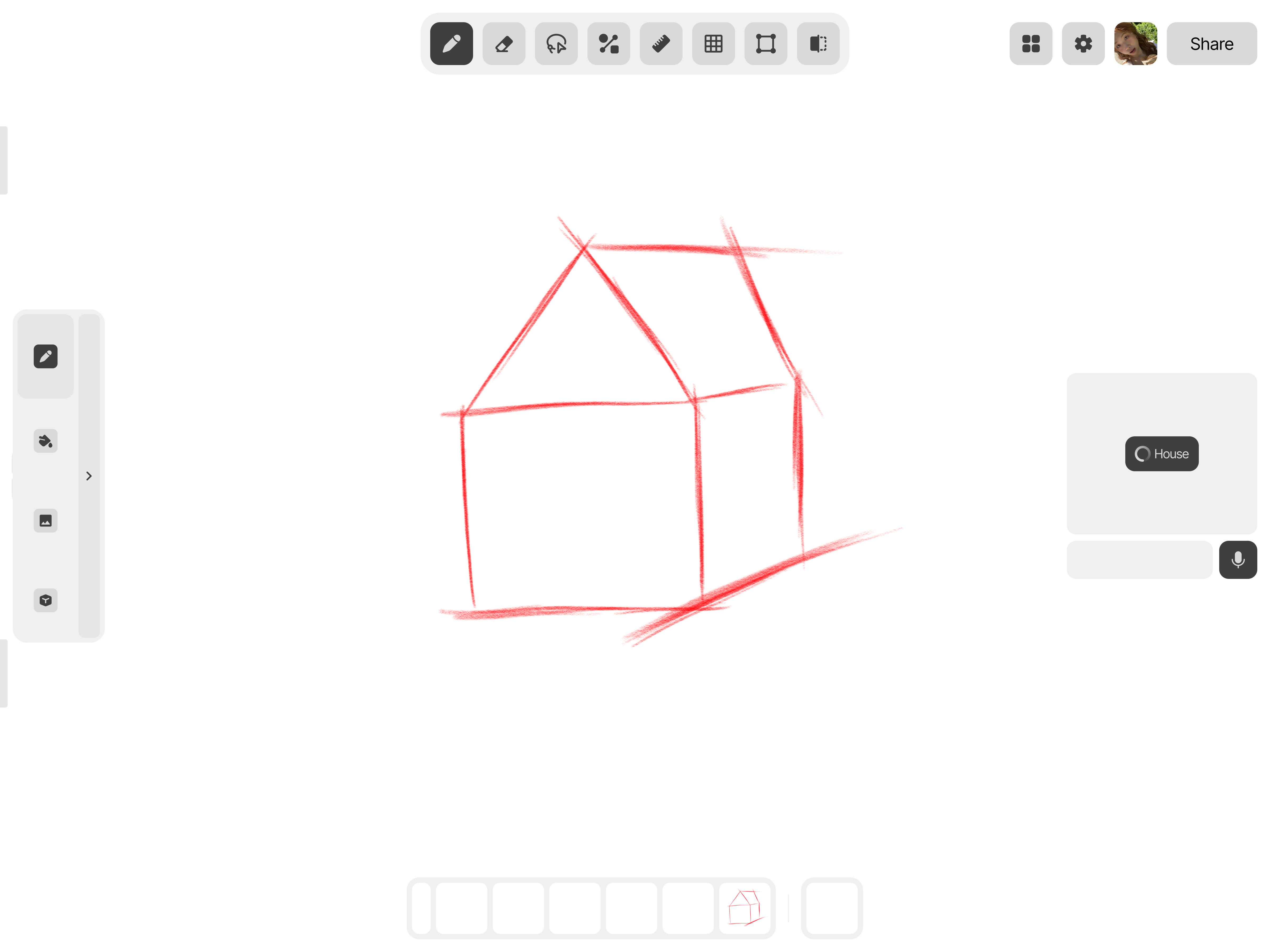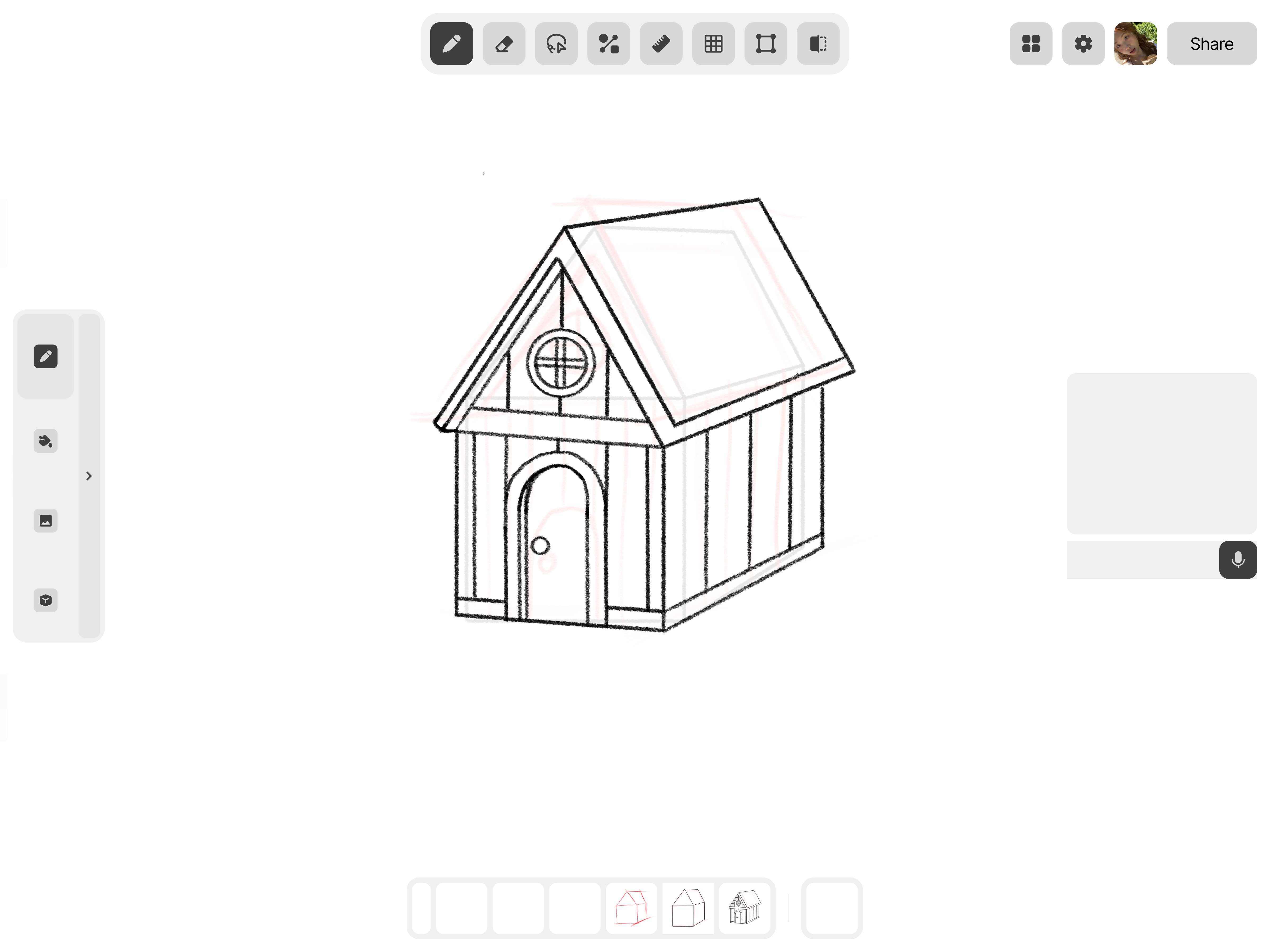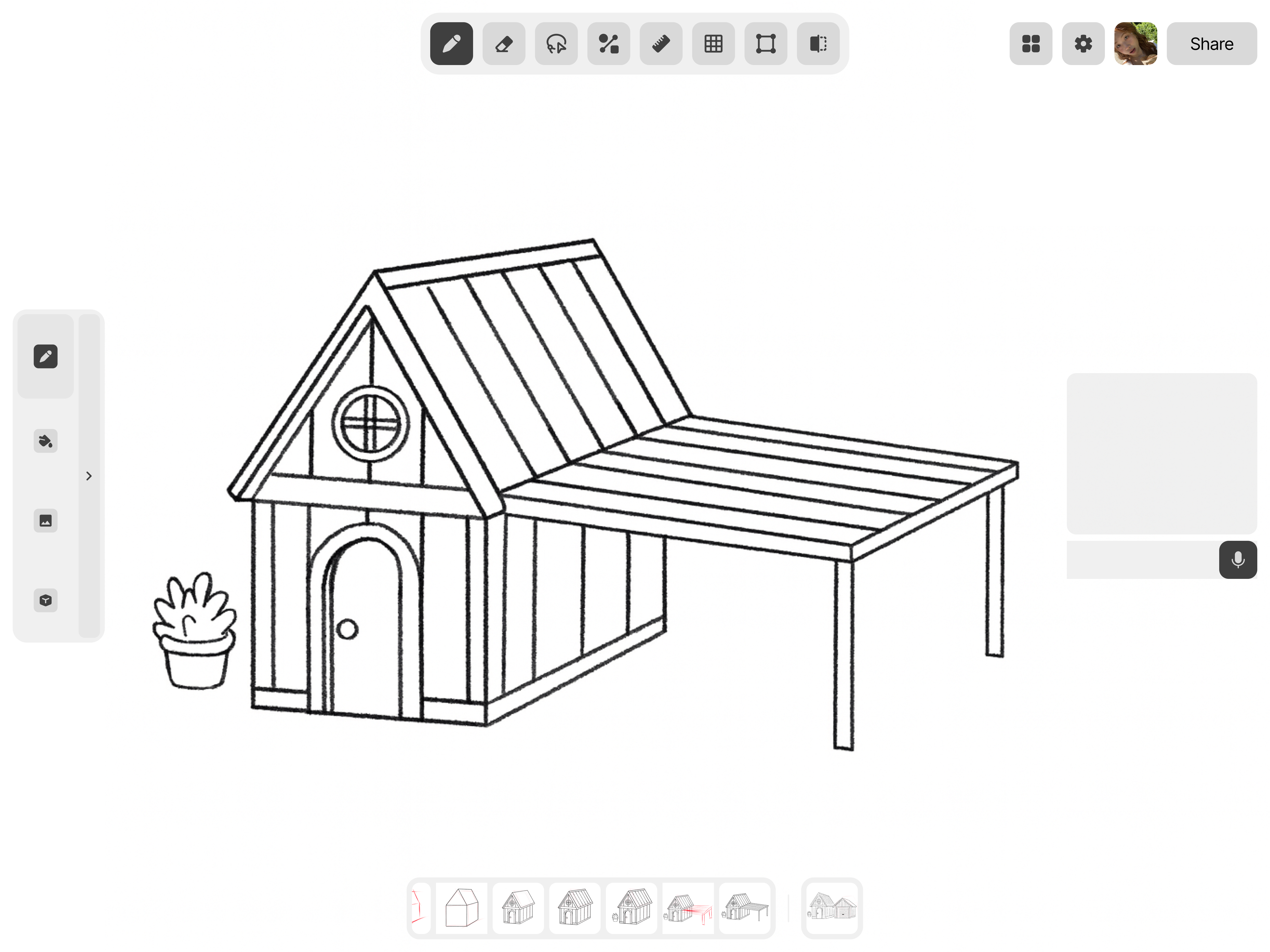 Für präzises Arbeiten erzeugt das Lineal-Werkzeug exakte Linien, der Raster-Umschalter sorgt für saubere Ausrichtung, und das Formwerkzeug fügt nahtlos integrierbare Formen hinzu. Das Symmetrie-Werkzeug spiegelt deine Zeichnung – ideal für Muster und Fassaden.
