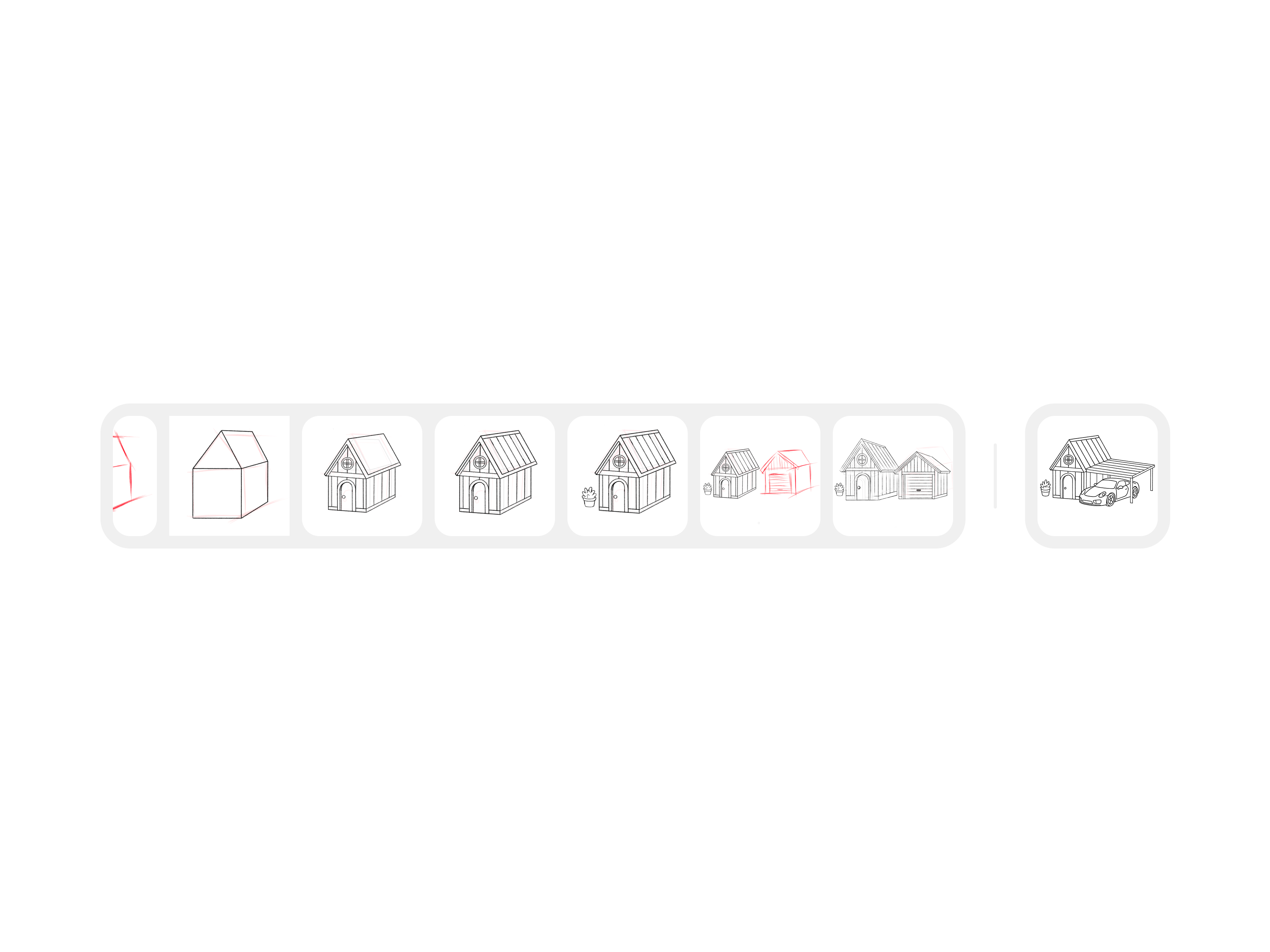 Erste SkizzeHaus erste IterationHaus mit CarportCAD Modell des HausesGerendertes Bild im Image Mode