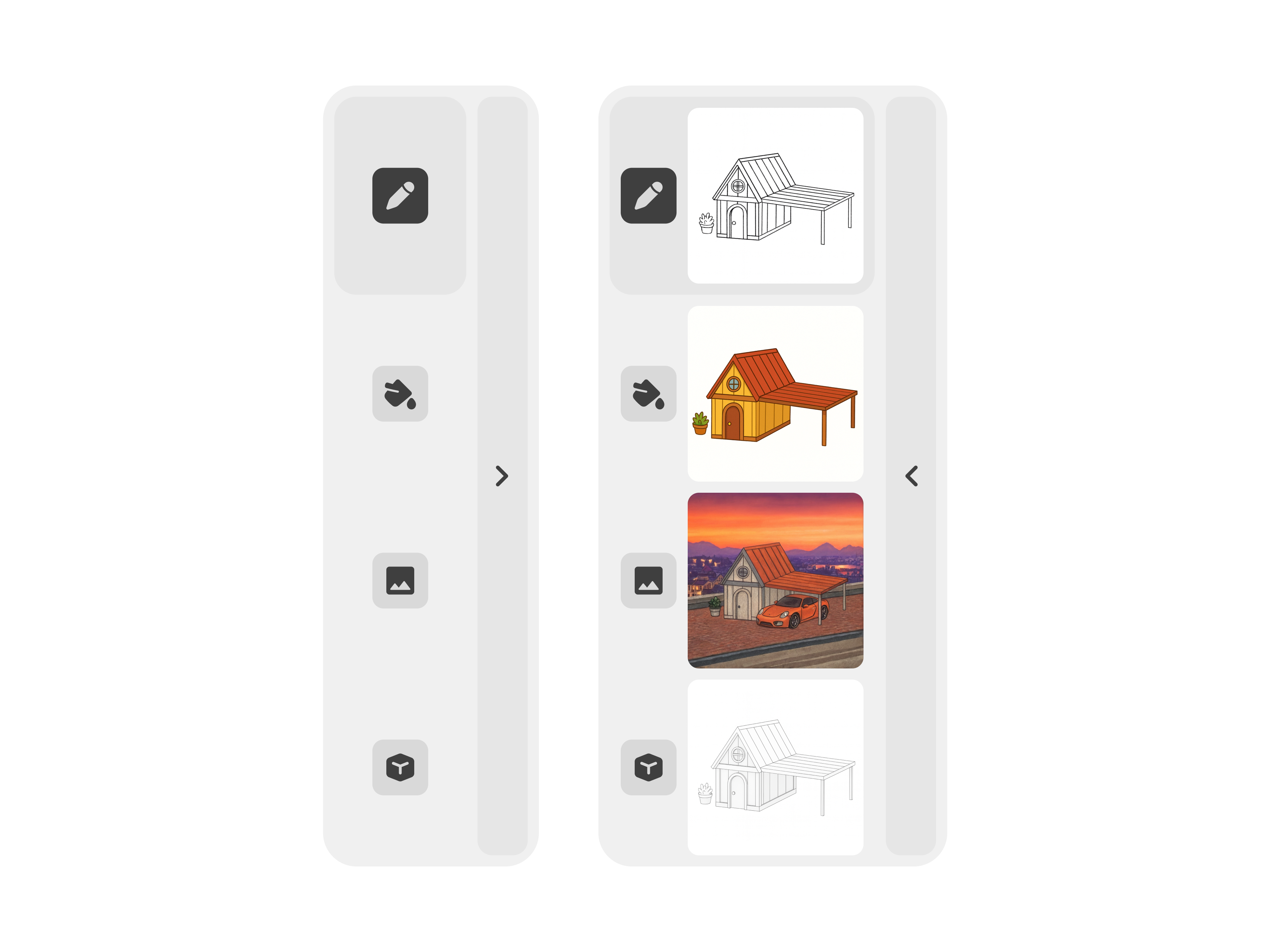 Je nach Fortschritt passt sich die Darstellung automatisch an. Du wechselst zwischen Sketch, Color, Image und CAD – um deine Idee als Zeichnung, koloriertes Konzept, realistisch interpretiertes Bild oder 3D-Modell zu sehen.