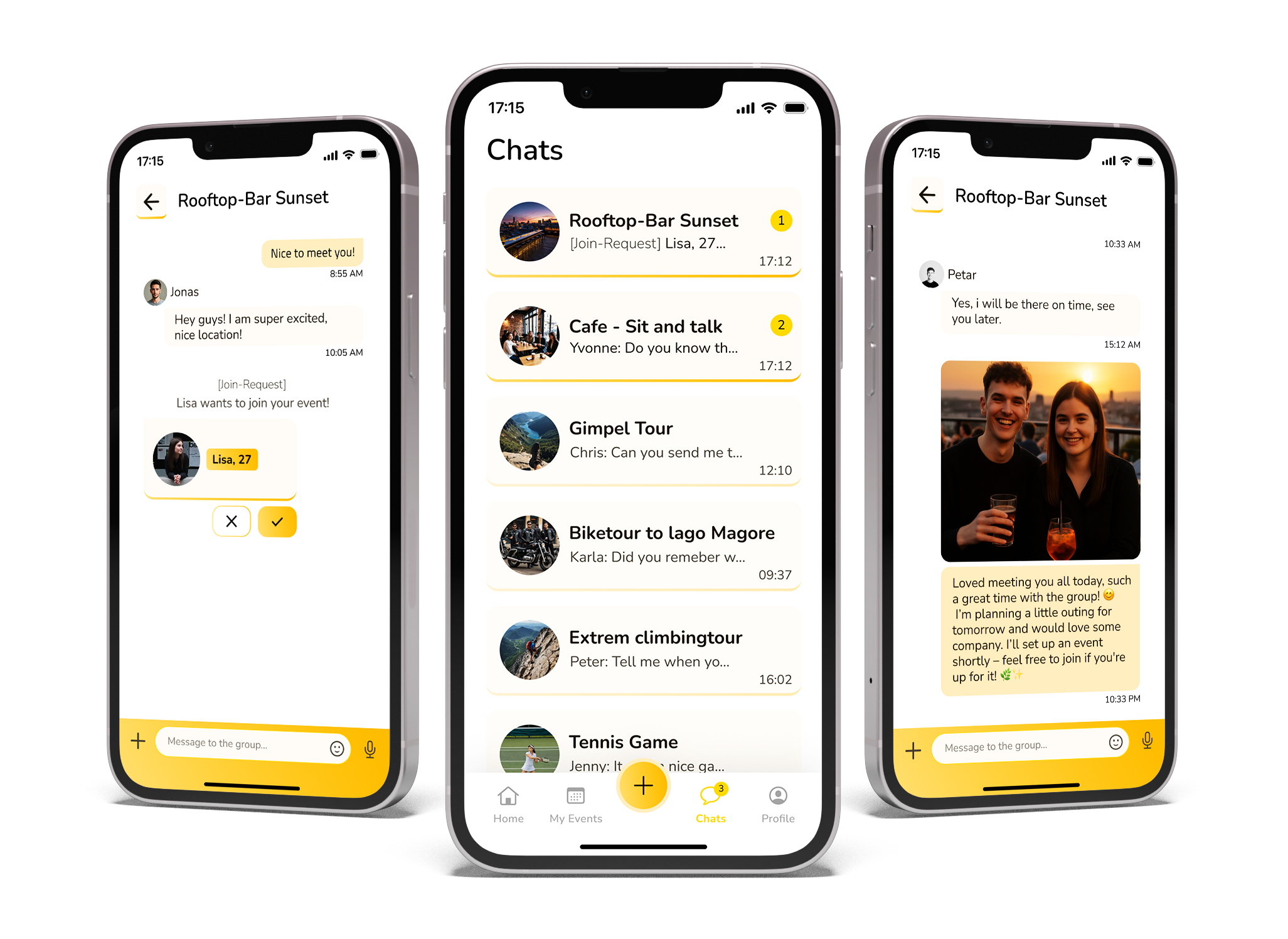 Hosts receive join requests directly in the chat, along with the requester’s profile — making it easy to decide if someone fits the group.