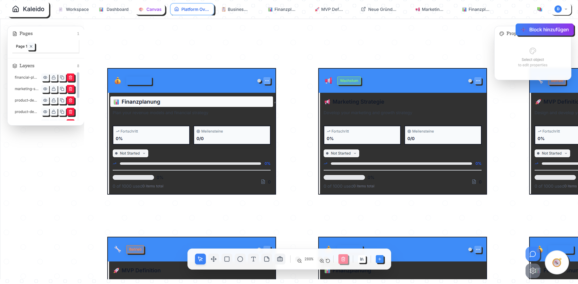 Das personalisierbare Dashboard mit Finanzplanung, Marketing und weiteren Business Blocks