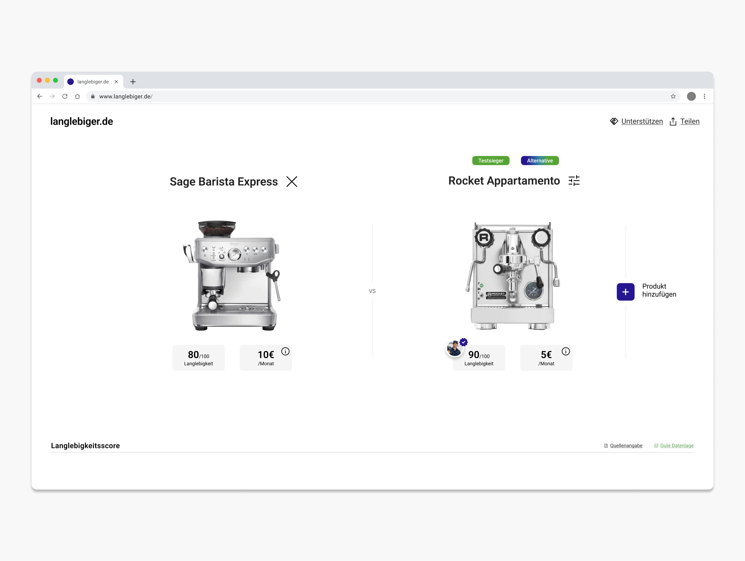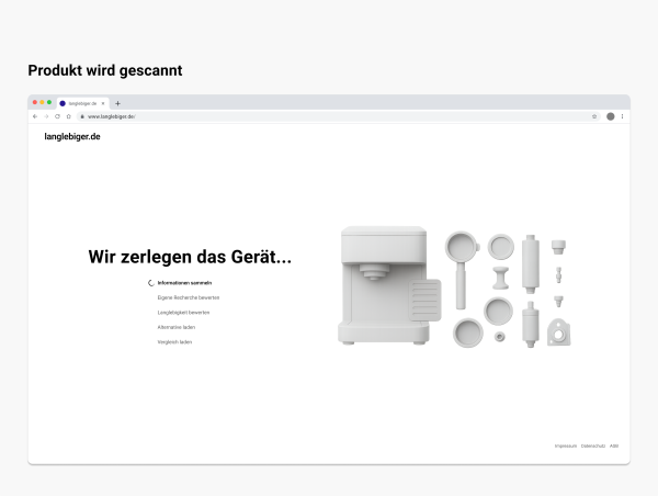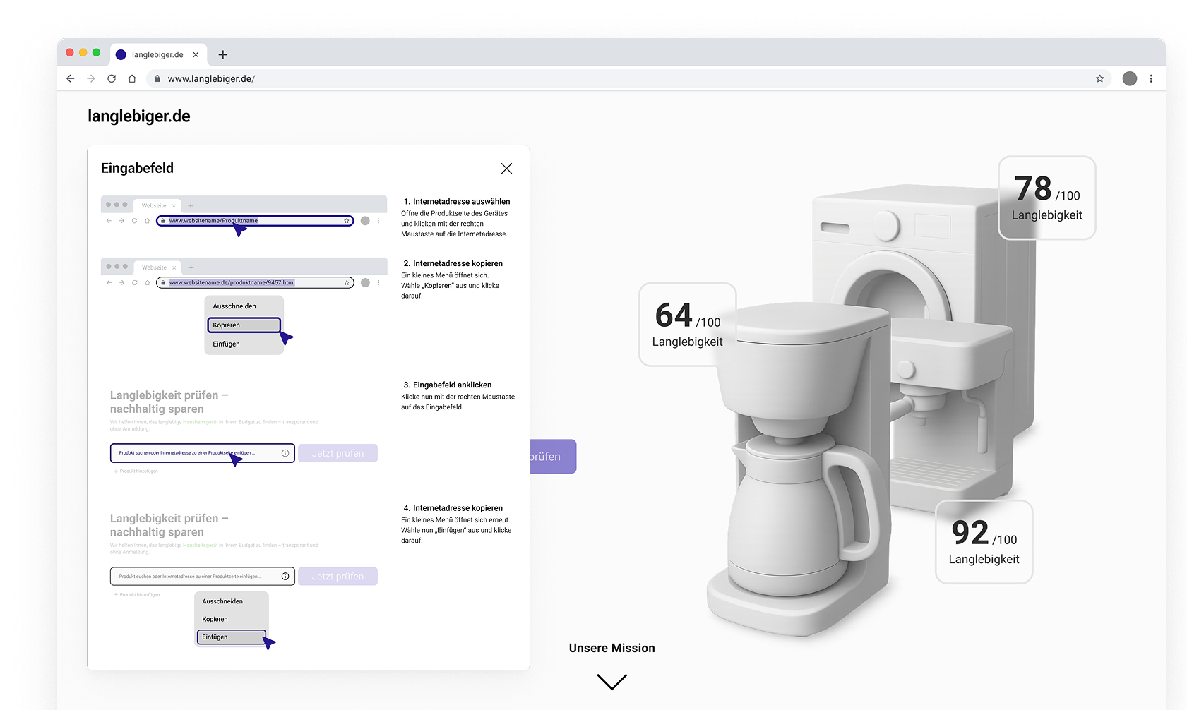 Unsere Website hilft dir dabei, langlebige Haushaltsgeräte auf einen Blick zu erkennen. Dafür brauchst du nur einen Produktlink – zum Beispiel von einem Online-Shop wie MediaMarkt oder Otto. Diesen Link fügst du bei uns ein. Im Hintergrund durchsucht unser System unabhängige Datenquellen zu Reparierbarkeit, Materialqualität, Herstellerangaben und Nutzerbewertungen. Daraus entsteht der Langlebigkeits‑Score: Eine übersichtliche Einschätzung, wie lange das Gerät voraussichtlich hält.