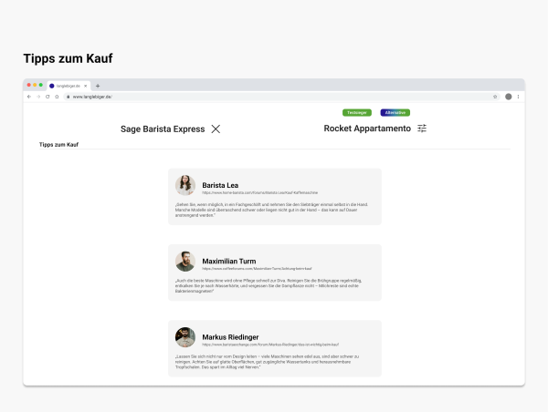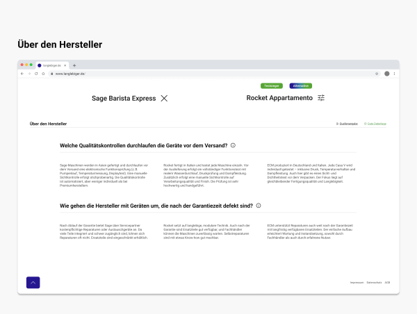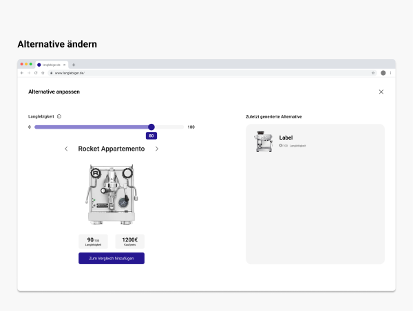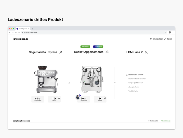 Schnell zur Klarheit. Was ist das langlebigste Produkt? Diese Frage muss sofort beantwortet sein – deutlich, nachvollziehbar und ohne Fachsprache. Technikwissen ist keine Voraussetzung. Unser Interface funktioniert auch dann, wenn jemand selten digitale Tools nutzt. Hinweise, einfache Sprache und visuelle Hilfen nehmen Nutzer an die Hand. Vertrauen durch Transparenz. Der Nutzer sieht, warum ein Produkt langlebiger ist. Jede Bewertung ist nachvollziehbar – nichts fühlt sich wie eine Blackbox an. Weniger, damit mehr ankommt. Viel Weißraum, klare Priorisierung und kurze Texte lenken den Blick auf das Wesentliche.