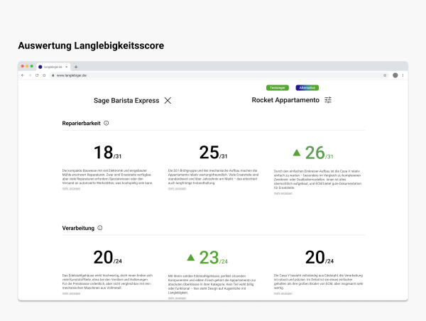 Der Score setzt sich aus fünf transparenten Kategorien zusammen: Reparierbarkeit, Verarbeitung, Garantie & Support, Software-Aktualität und Community-Erfahrung. Du siehst sofort, welche Stärken und Schwächen ein Gerät hat – klar gegliedert und leicht verständlich. So kannst du verschiedene Produkte vergleichen und eine fundierte Entscheidung treffen – für dich, dein Geldbeutel und die Umwelt.