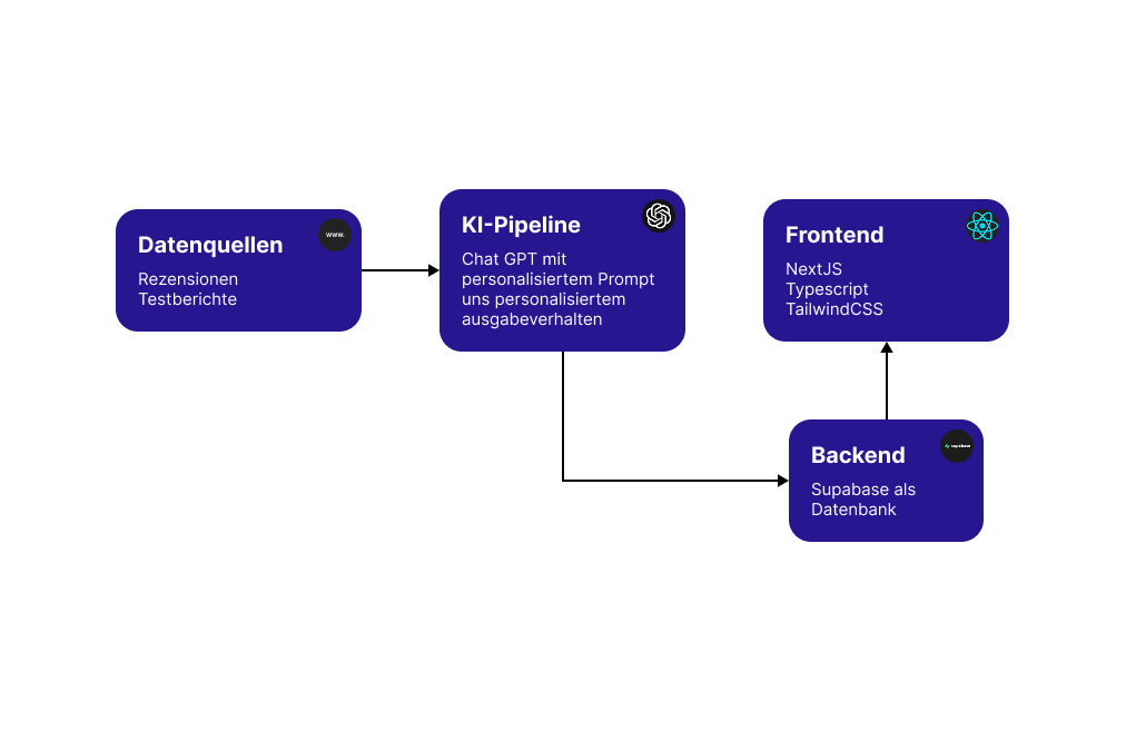 KI‑Pipelines analysieren hunderte Rezensionen und unabhängige Testberichte. Ein Vertrauens‑Layer kennzeichnet alle Quellen transparent und gewichtet sie nach Zuverlässigkeit. Frontend: Next.js, TypeScript, Tailwind – Desktop und Mobile und barrierefrei. Backend: Supabase als Datenbank für alle Infos über die Produkte.