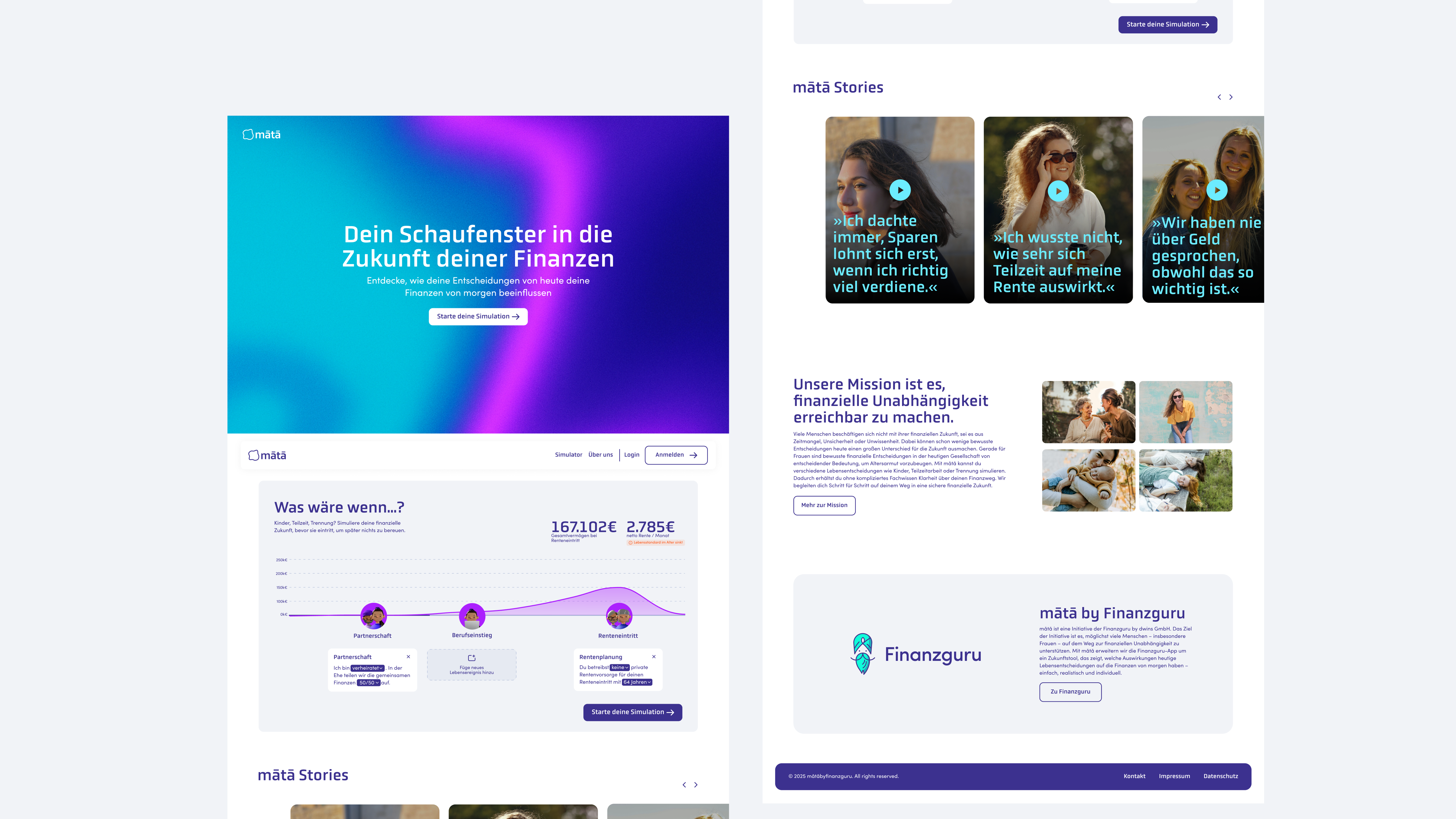 Ein zentrales Element von mātā ist ein interaktiver Simulator, der individuelle Lebensentscheidungen und deren finanzielle Langzeitwirkungen anschaulich darstellt. Nutzer:innen können verschiedene Szenarien durchspielen, beispielsweise wie sich ihr Vermögen mit oder ohne private Altersvorsorge, bei gemeinsamen oder getrennten Finanzen oder mit und ohne Kinder entwickelt. Die Anwendung visualisiert, welche Auswirkungen heutige Handlungen auf die persönliche finanzielle Zukunft haben. Dabei versteht sich der Simulator nicht als mahnende Instanz, sondern als Spiegel, der Orientierung bietet, Bewusstsein schafft und zur Reflexion einlädt. Frauen sollen nicht belehrt, sondern gestärkt werden. Sie haben die Möglichkeit, verschiedene Simulationen zu erstellen, miteinander zu vergleichen und am Ende konkrete Handlungsschritte zu erhalten, um den nächsten Schritt in Richtung finanzielle Unabhängigkeit zu gehen.