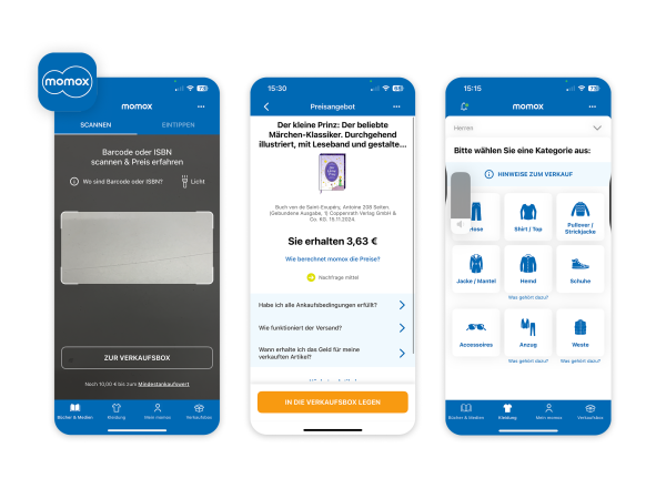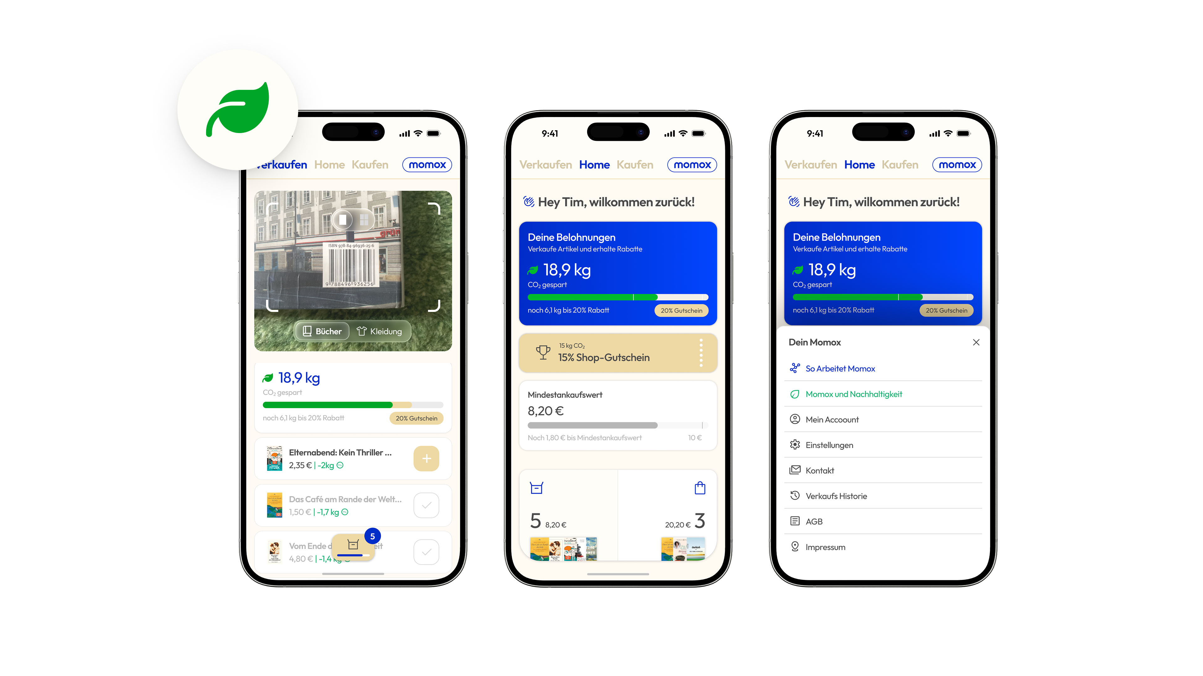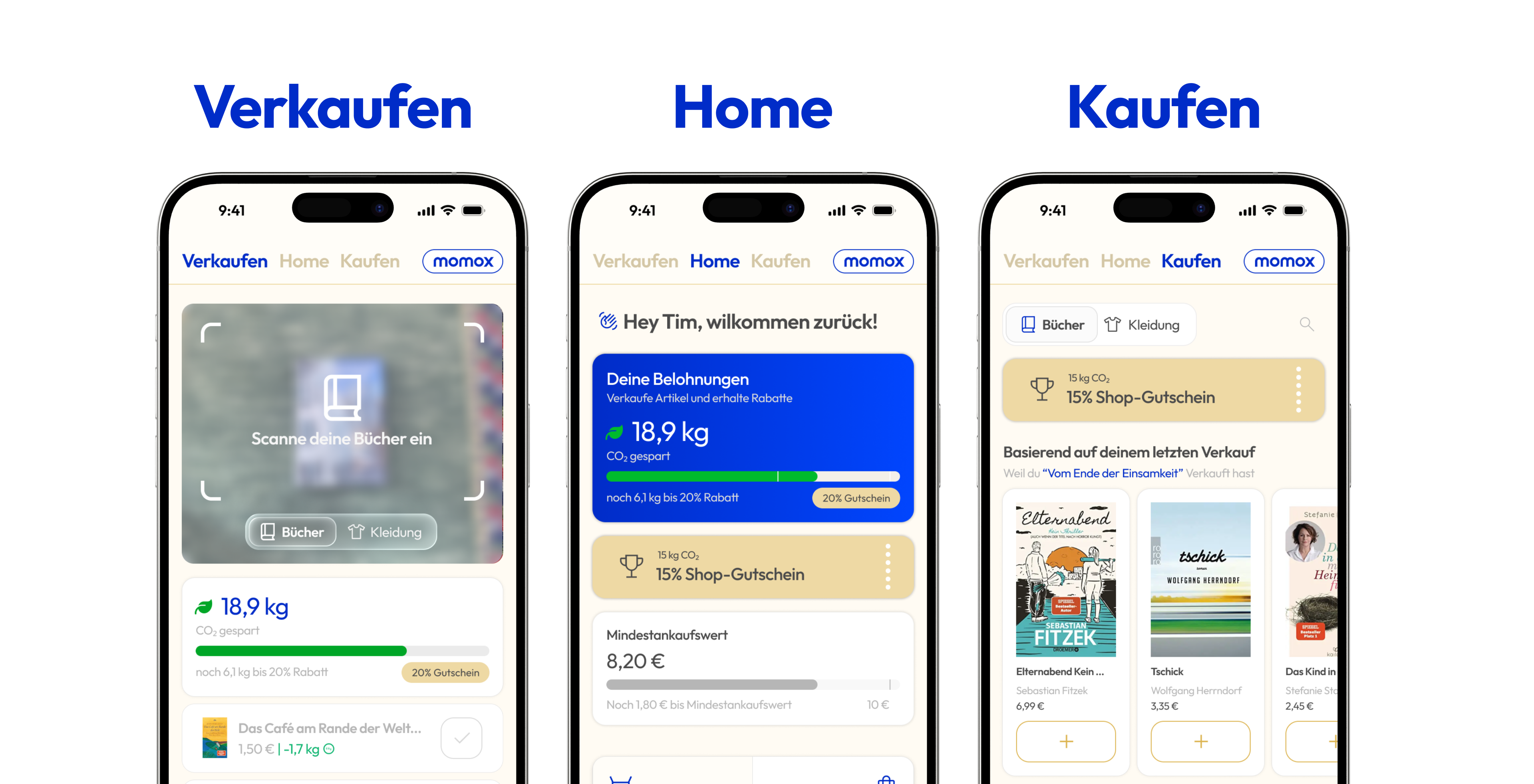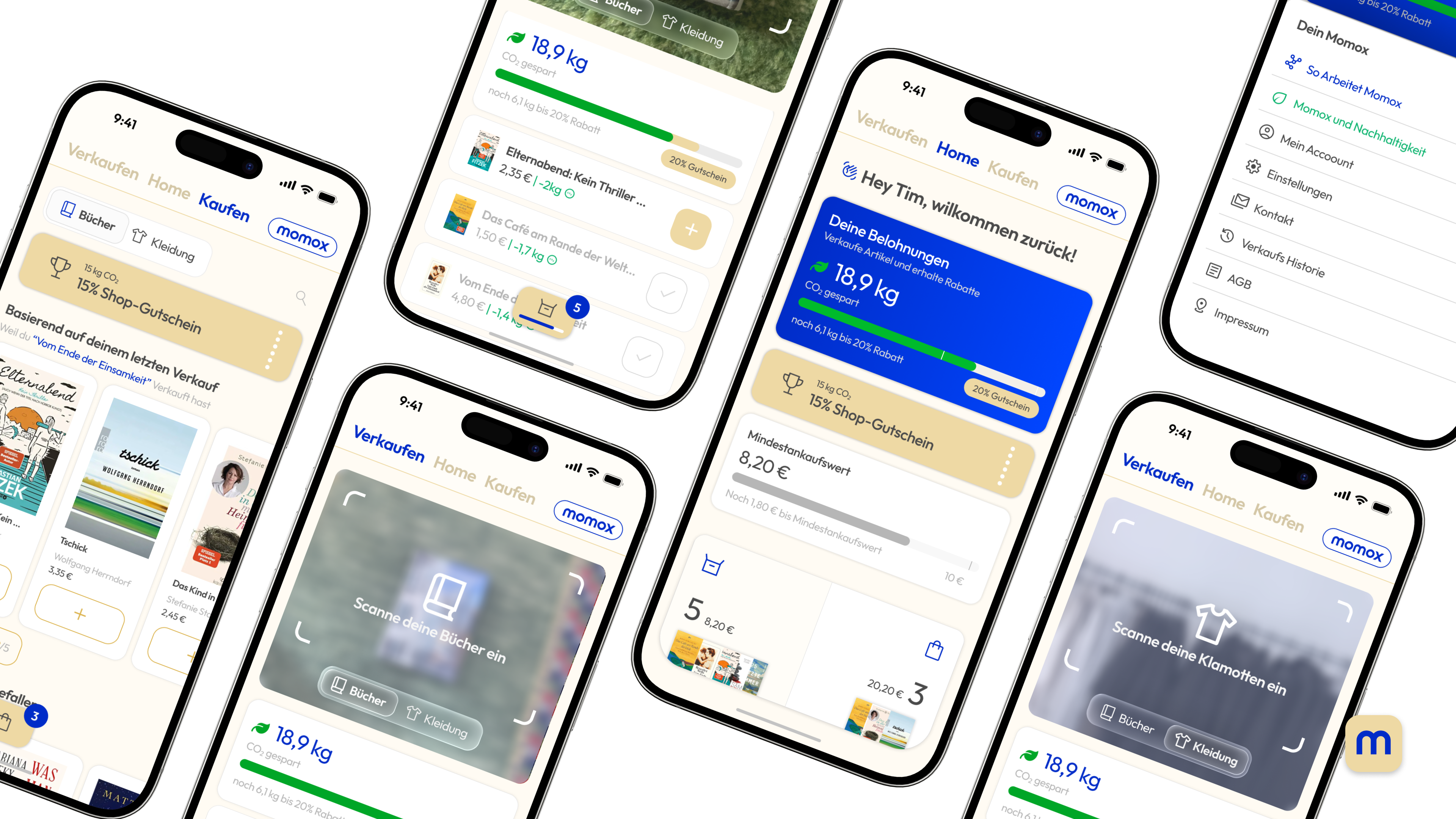 Die drei Momox-Apps waren getrennt, unübersichtlich und boten kein einheitliches Nutzungserlebnis. Funktionen wie der Scan waren umständlich, Nachhaltigkeit kaum sichtbar. Unser Redesign vereint alles in einer App – klarer, einfacher, nachhaltiger.