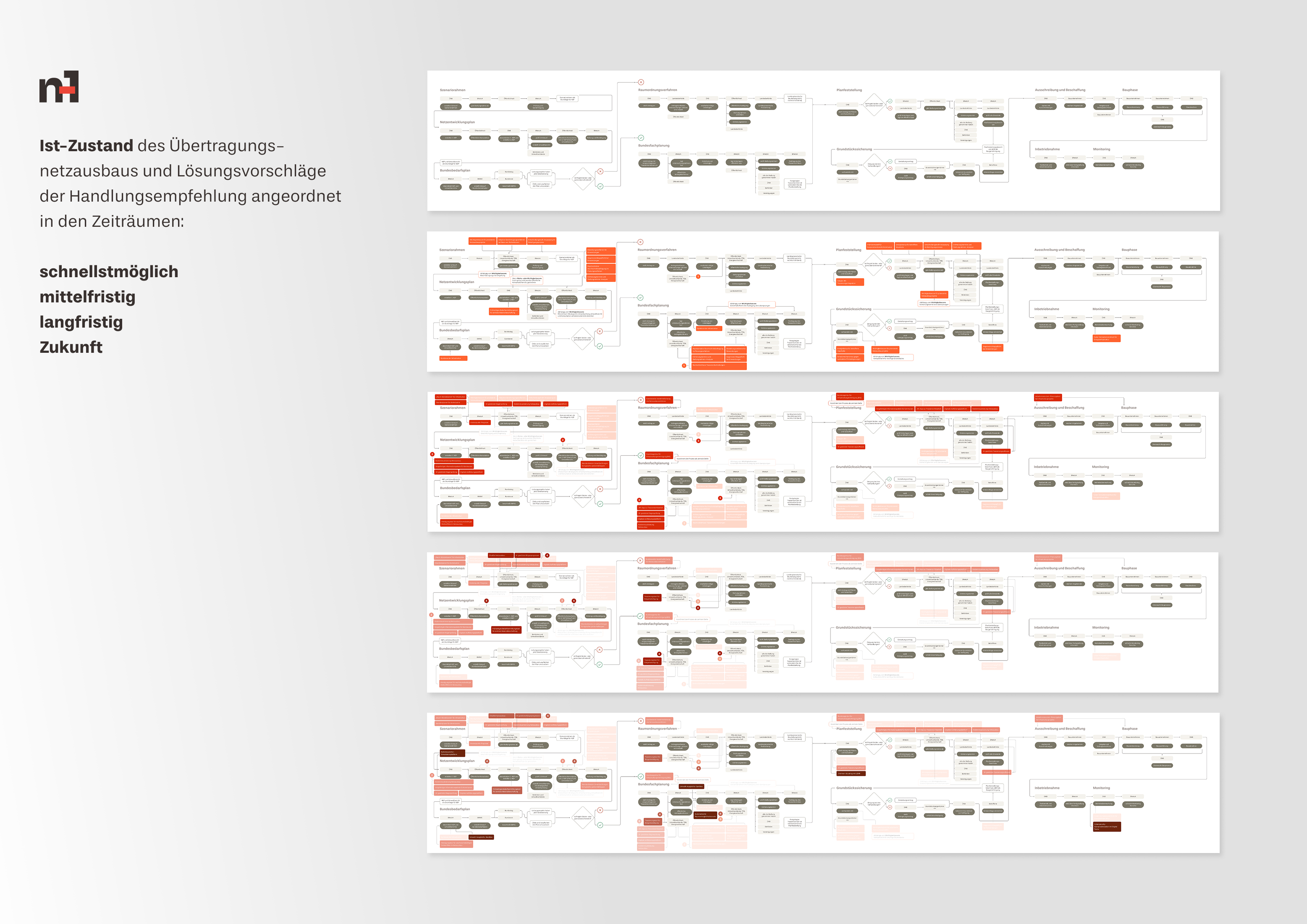 Zentrale Grundlage des Projekts ist eine eigens entwickelte System Map, die den gesamten Netzausbauprozess von der Bedarfsermittlung bis zur Umsetzung abbildet. Sie macht institutionelle Abhängigkeiten und Brüche sichtbar und diente als Strukturierungswerkzeug für die Handlungsempfehlung. Die vorgeschlagenen Lösungen wurden entlang dieser System Map verortet und in vier zeitliche Umsetzungsräume gegliedert: schnellstmöglich, kurzfristig, mittelfristig und zukünftig.