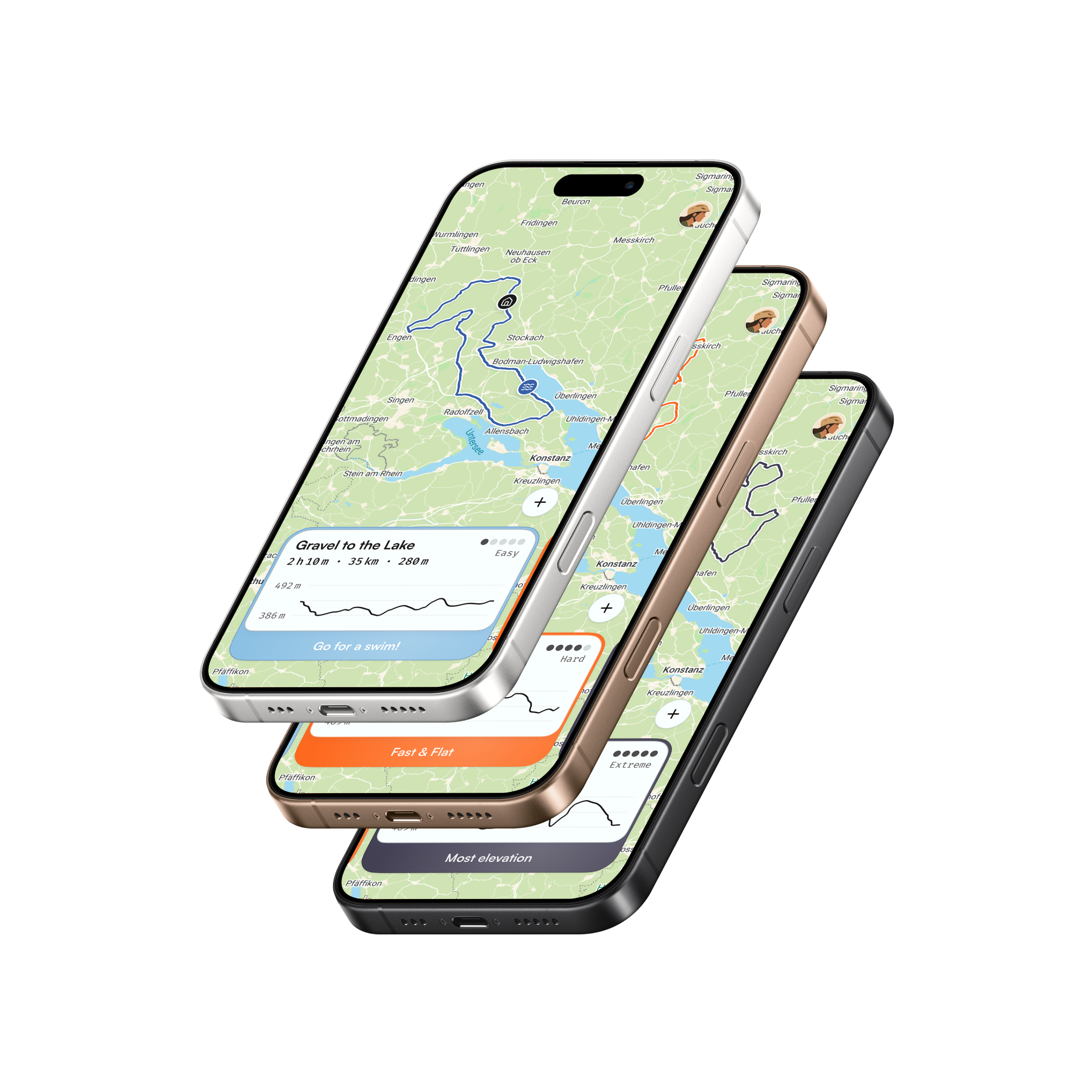 Unser finales Konzept basiert auf Routenprofilen, die dem Nutzer Kontrolle über die Routengenerierung geben, ohne ihn bei der Erstellung zu überfordern. Ein Nutzer kann mehrere Routenprofile anlegen, die jeweils aus individuell festgelegten Einstellungen bestehen, zum Beispiel Distanz, Höhenmeter, Dauer, Richtung und weiteren Parametern. Beim Öffnen der App werden sofort passende Routenvorschläge zu den vorhandenen Profilen angezeigt. Durch einen horizontalen Swipe über die Kachel kann einfach zum nächsten Profil und dessen Routenvorschlag gewechselt werden.