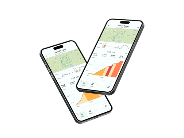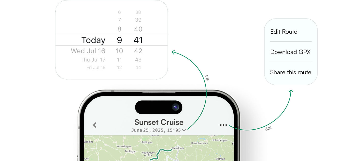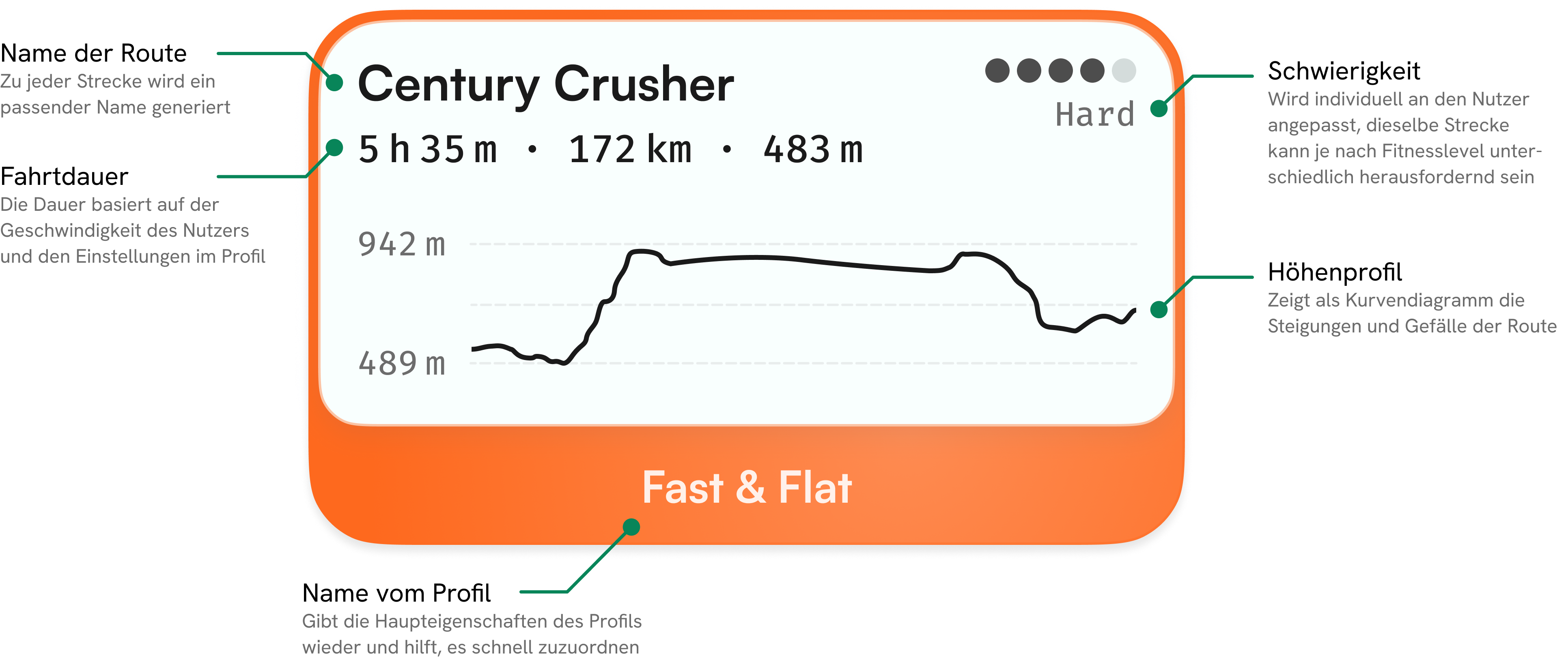 Im Header stehen der Name der Route sowie Startdatum und Uhrzeit. Diese Angaben sind Grundlage für mehrere Ansichten und lassen sich per Klick ändern. Darunter befindet sich eine Karte mit der Strecke in unserer Primärfarbe ausgefüllt. Der Start- und Endpunkt ist mit einem dunkelgrauen Punkt vorgesehen. Basisinformationen wie Schwierigkeitsgrad, Dauer, Distanz, Höhenmeter und Durchschnittsgeschwindigkeit werden im unteren Bereich mit passenden Icons dargestellt.