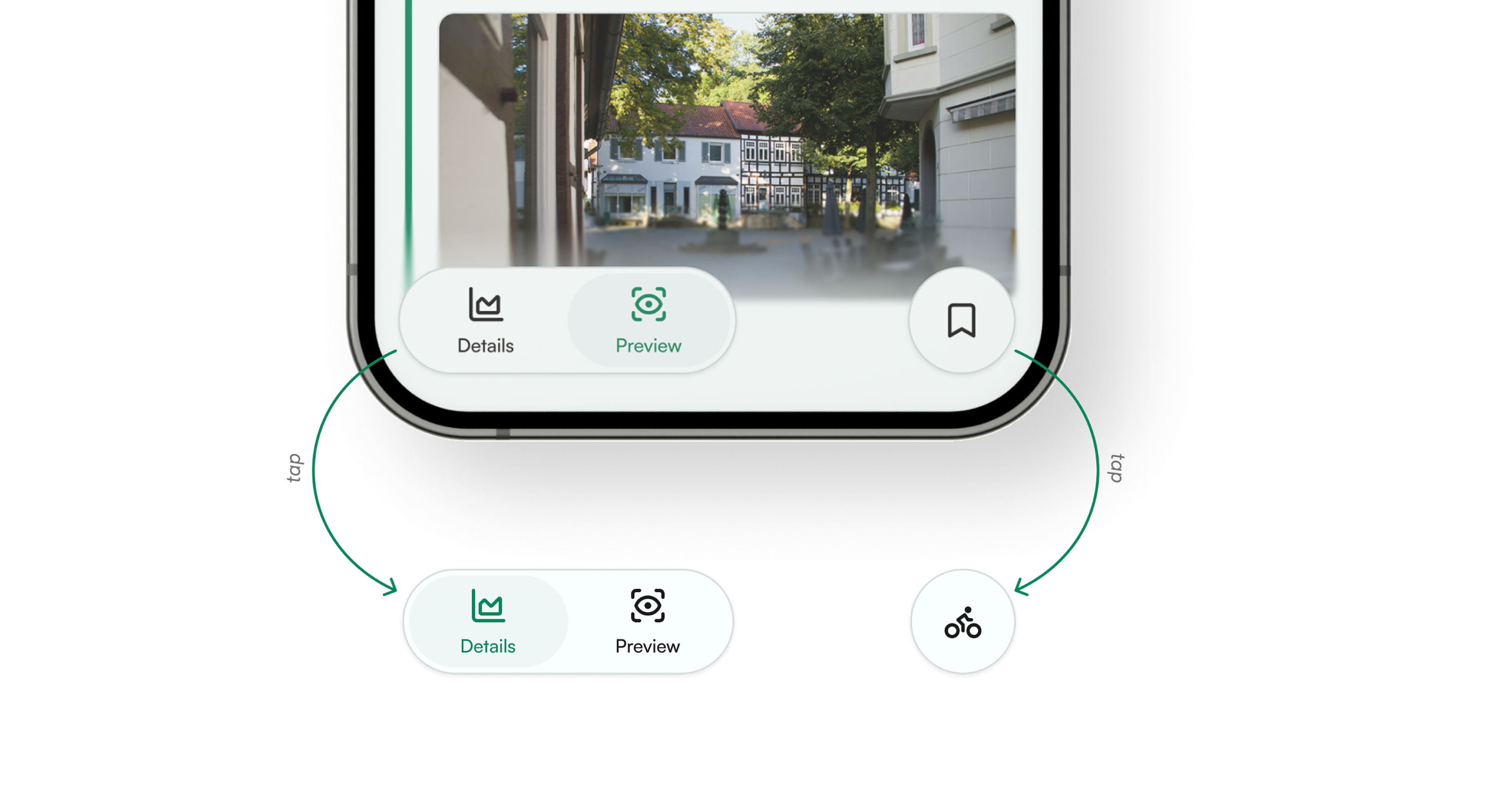 Die Navbar ermöglicht links den Wechsel zwischen der Detailansicht und der Preview. Rechts befindet sich ein Button mit einem Save-Icon. Beim Speichern animiert sich das Icon zu einem Fahrrad. Durch Tippen auf das Fahrrad-Icon kann die Route anschließend über ein verbundenes Garmin-Gerät navigiert werden.