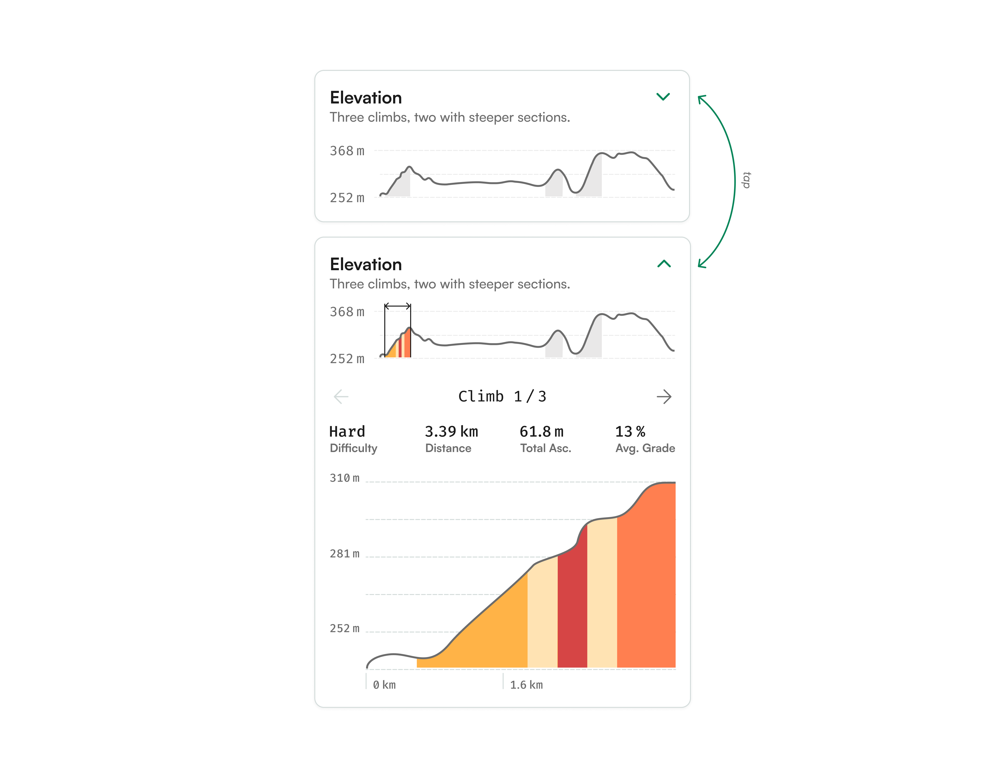 Unter dem Diagramm wird der einzelne Steigungsabschnitt angezeigt. Direkt darunter erscheint der jeweilige Steigungsabschnitt mit den wichtigsten Informationen: der individuell berechneten Schwierigkeit, der Länge des Anstiegs in Kilometern, den überwundenen Höhenmetern sowie der durchschnittlichen Steigung in Prozent.