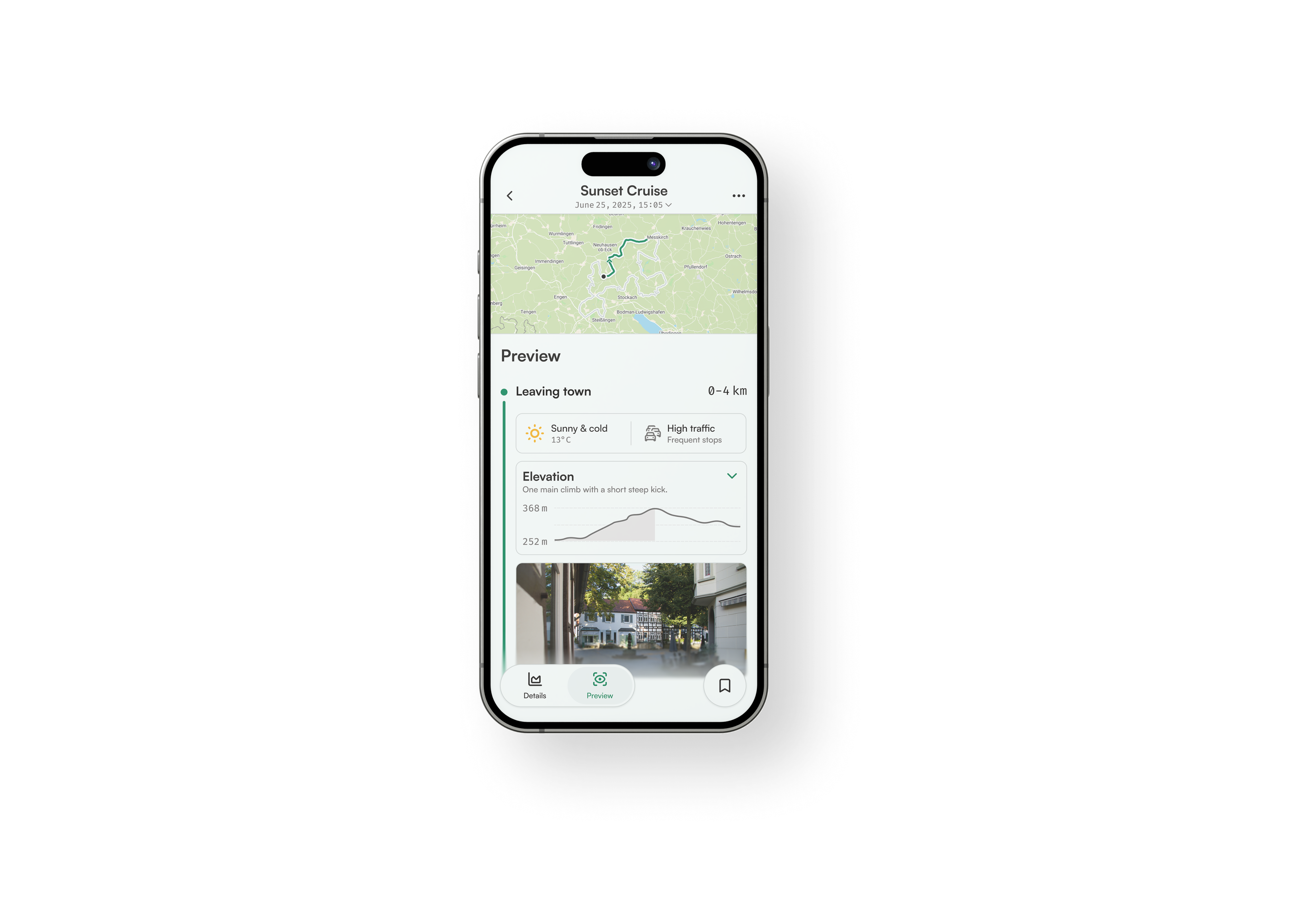 Jeder Abschnitt ist dynamisch aufgebaut, einige Infos sind aber immer dabei. Dazu gehören ein passender Name, die Länge des Teilstücks in Kilometern, das Wetter und der Verkehr. Zusätzlich helfen ein Höhenprofil und ein Community-Bild aus dem Abschnitt dabei, sich die Route besser vorstellen zu können.